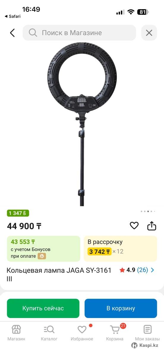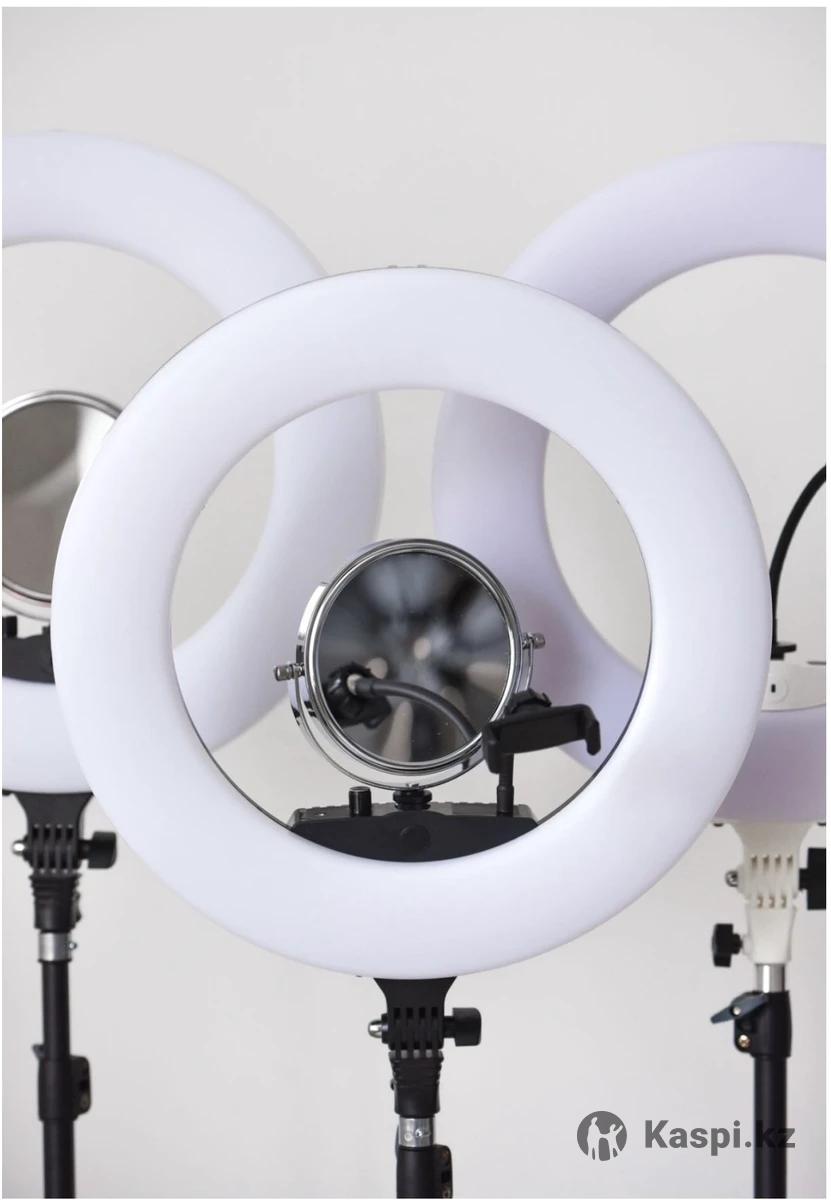 Кольцевая лампа SY-3161 III В идеальном состоянии , пользовалась 1 раз Покупала через Инстаграм за 45000 тенге Кольцевая лампа с мягким комфортным светом, за счет плотного/матового рассеивателя. С устойчивым штативом. Диаметр 45 см 480 LED Широкое кольцо- очень важный факт Цифровой дисплей 2 USB для зарядки телефона Мощность: 96 ват САМАЯ мощная из всех ламп Регулировка света от 3200 до 5500 кельвина (холодный/теплый/нейтральный) Индекс цветопередачи больше 95 га В комплекте. • Штатив УСИЛЕННЫЙ (устойчивый) 2.1 м • 1 держатель для телефона •Есть разъём для аккумуляторов •Дистанционный пульт для регулировки яркости и температуры лампы • Сумка
