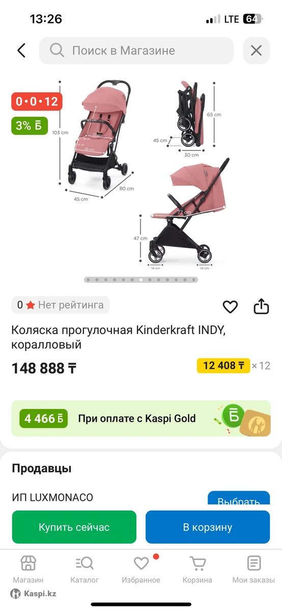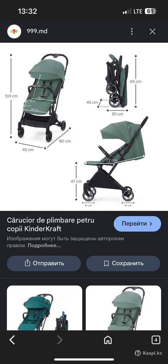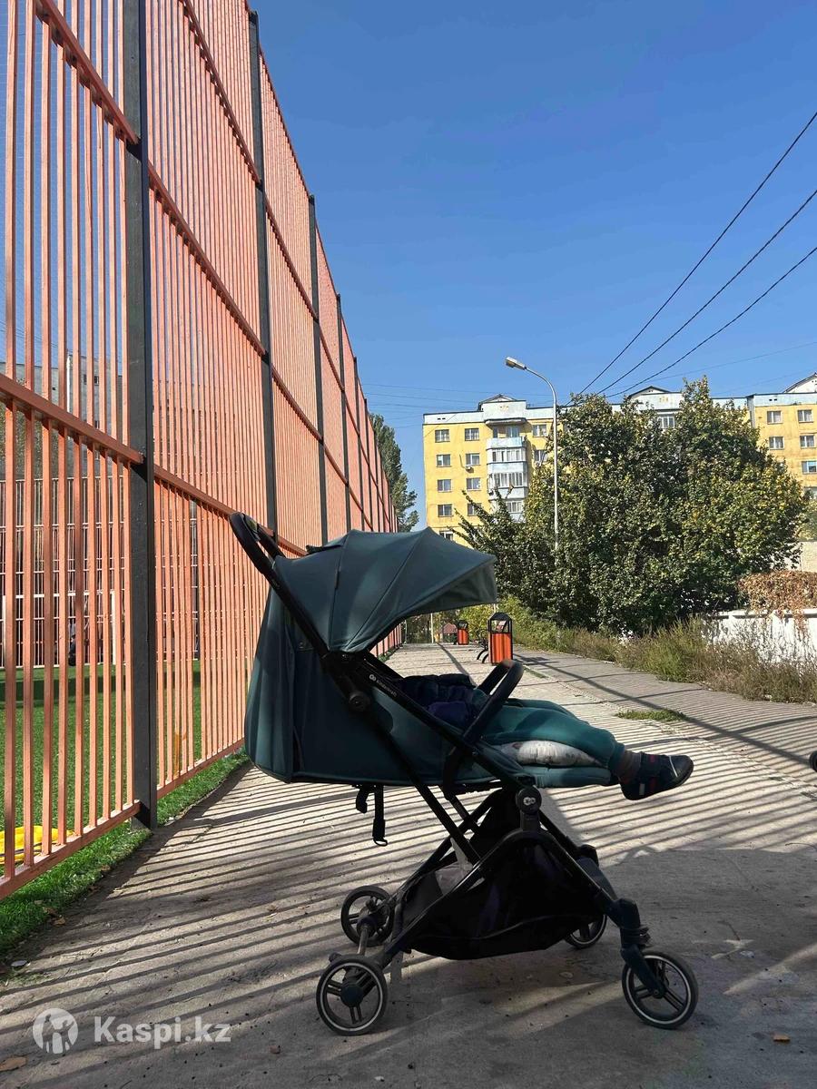 Коляска зеленого цвета kinderkraft Indy зеленого цвета. Очень маневренная, удобная и легкая. Имеет 3 положения спины. Покупала за 120 тысяч тенге полтора года назад. Сейчас такие коляски стоят 149 тысяч тенге на каспи магазине.