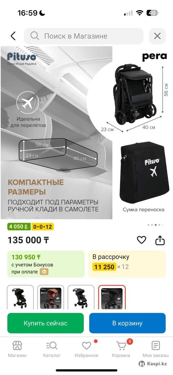 Продам коляску Pituso Pera В новейшем состоянии,качественная карбоновая рама,без дефектов.Пользовались недолго,так как ребенок категорически отказывался сидеть. Компактная и легкая,вес всего 5,7 кг.Можно брать на борт самолета.Отлично подходит для путешествий и повседневного использования,можно и с рождения. Легко складывается одной рукой. Ручка не перекидывается,но есть смотровое окошко для наблюдения за ребёнком. В комплекте:чехол на ножки,подстаканник,чехол для коляски. Москитную сетку и дождевик покупали отдельно. Еще есть матрас Все вместе продам за 55тыс тг