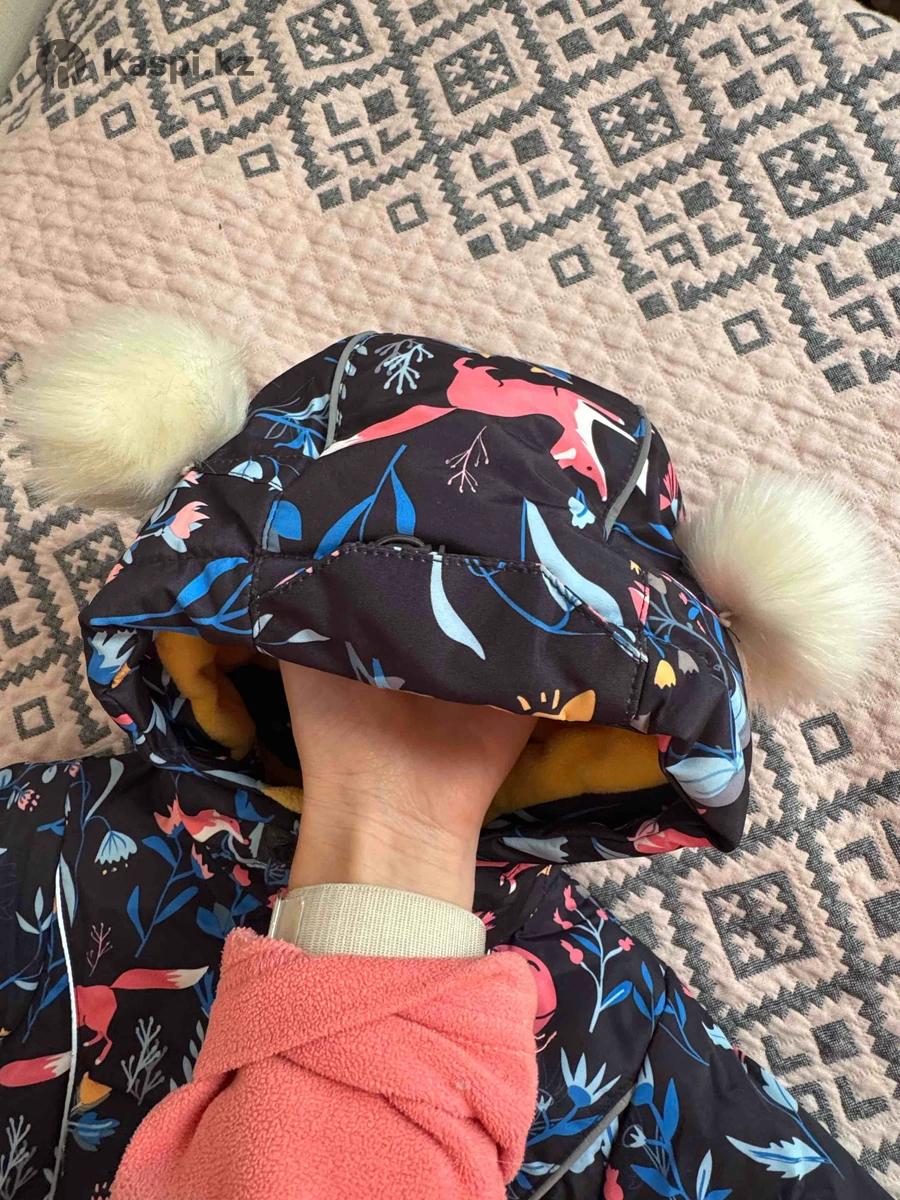 Комбинезон зимний на рост 98 см. Очень теплый. Капюшон не съемный. Помпоны на капюшоне не съемные. Внутри флис ярко желтого цвета. Имеются штрипки для обуви.