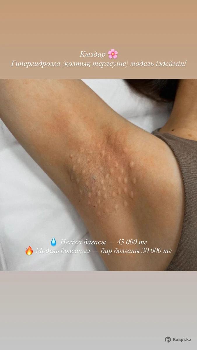 💉 Лечение гипергидроза подмышек (ботулотоксин) Ищу модель на процедуру лечения гипергидроза (повышенное потоотделение) в области подмышек. ✨ Эффект 6–9 месяцев ✨ Комфорт и уверенность каждый день ✨ Без мокрых пятен и запаха 💰 Цена: 30 000 тг Для записи: