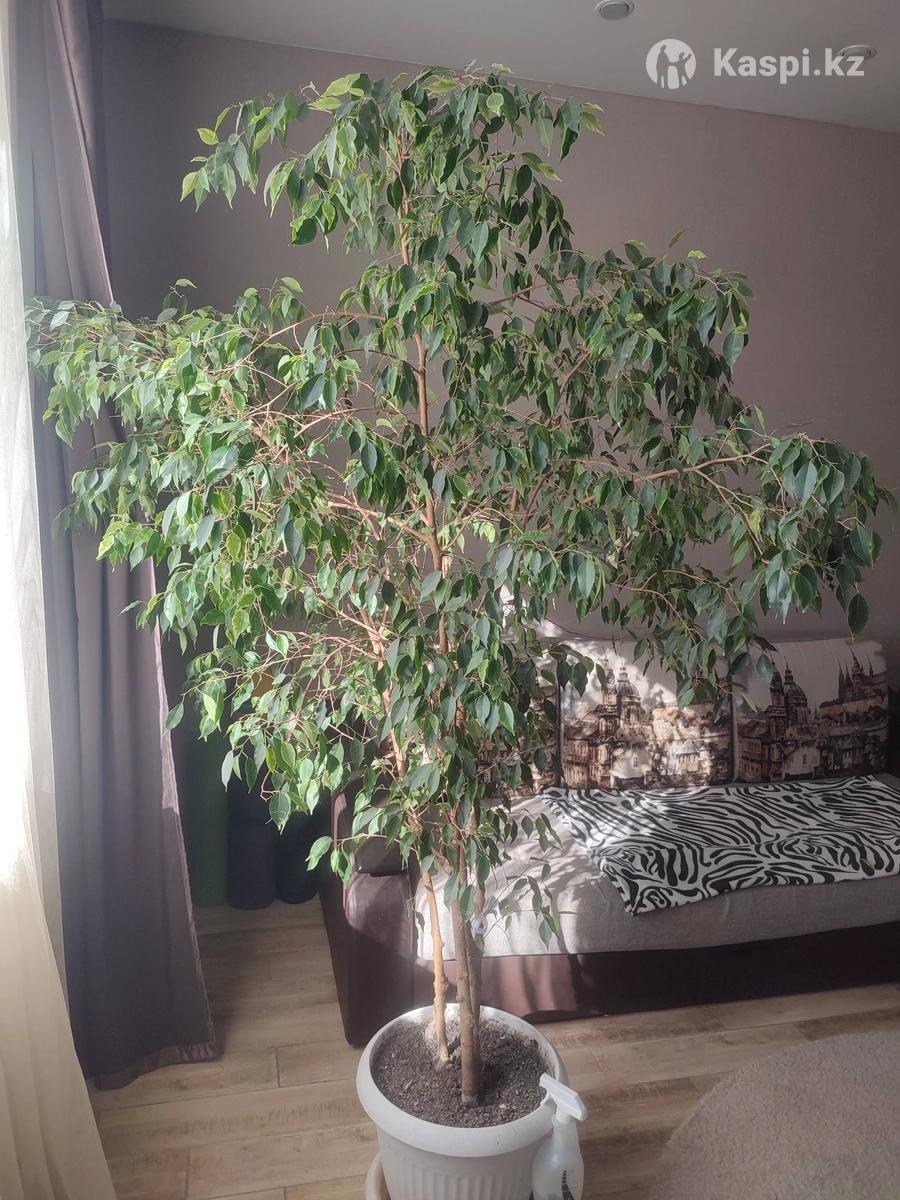 Фикус Бенджамина, высота 2,0 м, ширина кроны 1,5 м. В одном горшке три ствола (толщина до 20 мм). Листья мелкие, в основном зеленые, есть отдельные листья с светло-зеленой/почти белой каймой (частичная вариегатность). Крона — средняя, растение здоровое, без вредителей. Горшок пластик-керамика, поддон в комплекте. Самовывоз (Уральск). Возможна городская доставка за дополнительную плату. Цена 65 000 тг