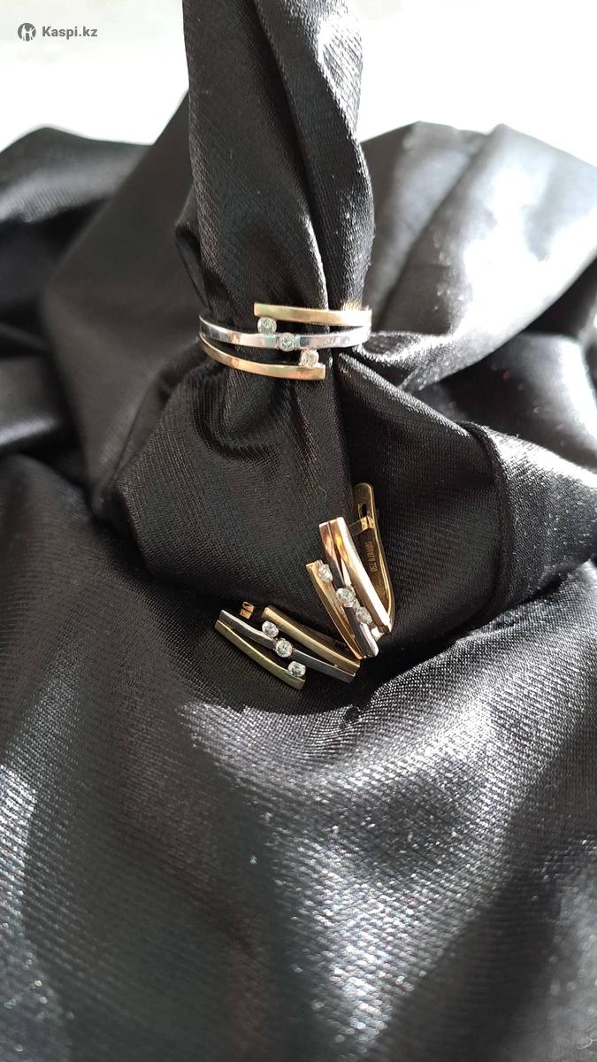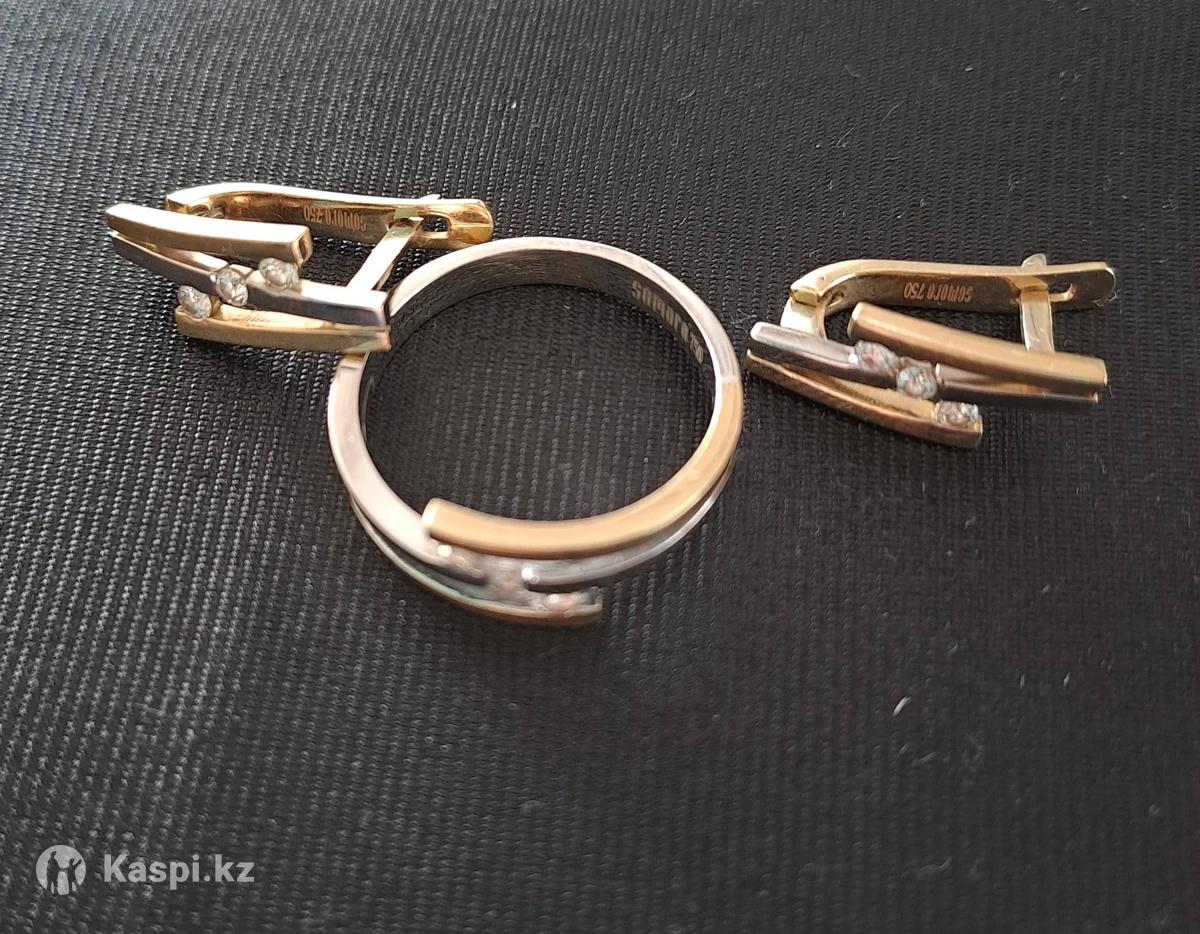 Золотой комплект с бриллиантами 750 пробы жёлтое с белым комбинированное. Общий вес 8 гр. Размер кольца 17.5-18. Этикетка имеется. Срочно. Торг.
