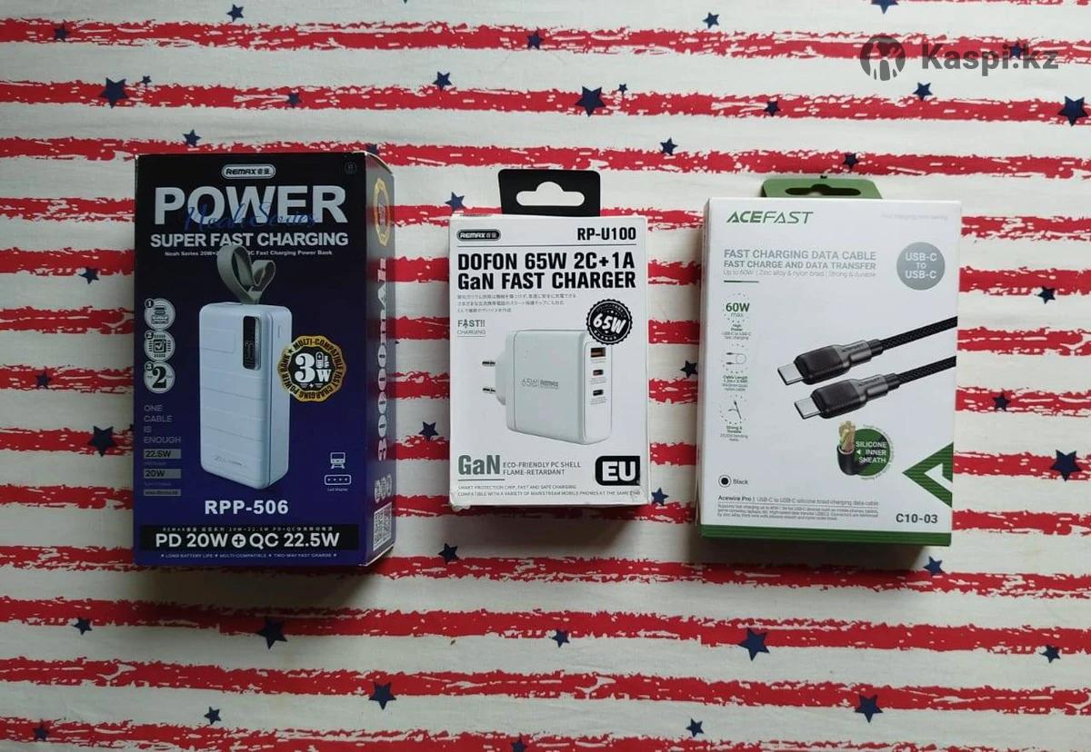 Комплект аксессуаров Remax Power bank мощность 30000mah сине-темный цвет Адаптер PD Remax супер быстрая зарядка 65W цвет белый Кабель Acefast PD type-c 60w цвет черный цена за все комплект Цена договорная