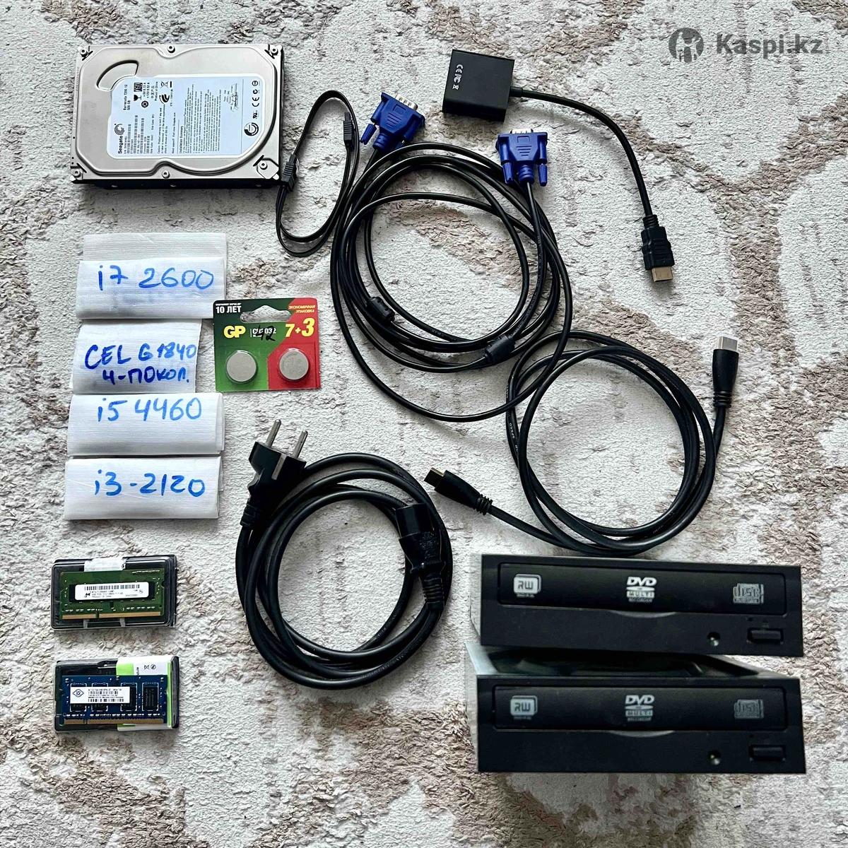 Провод питания: 1500 DVD ROM в идеале по 2000 Батарейки CR 2032 GP новые по 500тг VGA и hdmi кабели новые по 1000 Переходник VGA(мама)-HDMI (папа) по 1500 Кабели Sata 3 по 1000 Корпус компьютера в отличном состоянии Цена 4000 Процессор: Intel Core i3-2120 LGA1155 Ядра / потоки: 2 / 4 3.30 ГГц Цена: 3000 Процессор Intel Celeron G1840 LGA1150 4 поколение 2/2 2.8 ГГц Цена: 3000 Процессор i5-4460 4 ядра 4 потока сокет 1150 3,4 ГГц Цена 9000 Процессор i7-2600 4 ядра 8 потоков сокет 1155 Цена 15000 Есть блок питания на 450 Вт Huntkey с разьемом под видеокарту 6 пин Цена за блок 5000 Hdd 500гб 4000 DDR3 2гб оперативка для ноутбука SO-DIMM Полное название MT8JTF25664HZ-1G6M1 2GB 1RX8 PC3-12800S-11-11-82 Цена 2000 DDR2 1GB оперативка для ноутбука SO-DIMM Полное название NT1G1S4UH8D0FN-3C 1GB 2Rx16 PC2-5300S-555-13-A2.667 Цена 1500 Все рабочее, дам гарантию, пишите подскажу