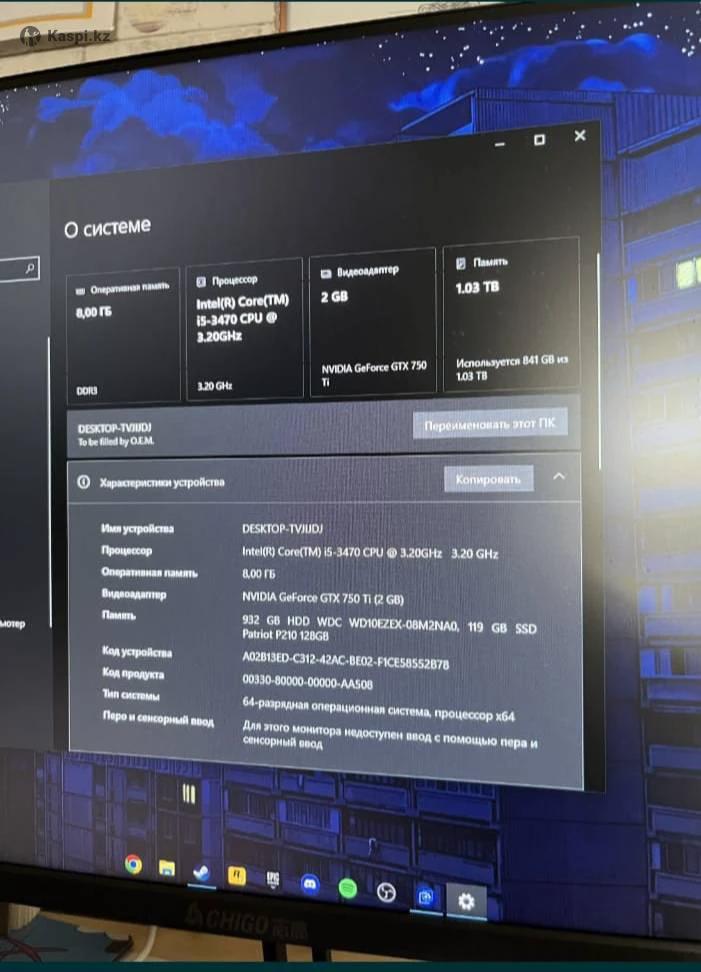 Игровой ПК в отличном состоянии + Механика в подарок! 🎁 Продам системный блок в хорошем техническом состоянии. Подойдет как для учебы/работы, так и для игр (CS:GO, Dota 2, World of Tanks, Valorant и др. идут уверенно). Почему стоит взять именно этот ПК: Скорость: Благодаря SSD-диску система загружается за считанные секунды, а программы «летают». Надежность: Проверенная временем связка Intel i5 и GTX 750 Ti — золотой стандарт для популярных онлайн-игр. Память: Огромный запас места (1 ТБ общего объема) для ваших фото, видео и тяжелых игр. Бонус: Отдаю крутую механическую клавиатуру совершенно бесплатно! Характеристики: Процессор: Intel Core i5-3470 (4 ядра до 3.60 GHz) Видеокарта: NVIDIA GeForce GTX 750 Ti (2 GB) ОЗУ: 8 GB DDR3 Накопители: Скоростной SSD 128 GB + Вместительный HDD 932 GB Состояние: Отличное, любые проверки на месте. Цена: 110 000 тг По всем вопросам писать в или позвонить на номер: Процессор Intel(R) Core(TM) i5-3470 CPU 3.20 GHz Оперативная память 8,00 ГБ DDR3 Видеокарта NVIDIA GeForce GTX 750 Ti (2 GB) Память 932 GB HDD 128 GB SSD
