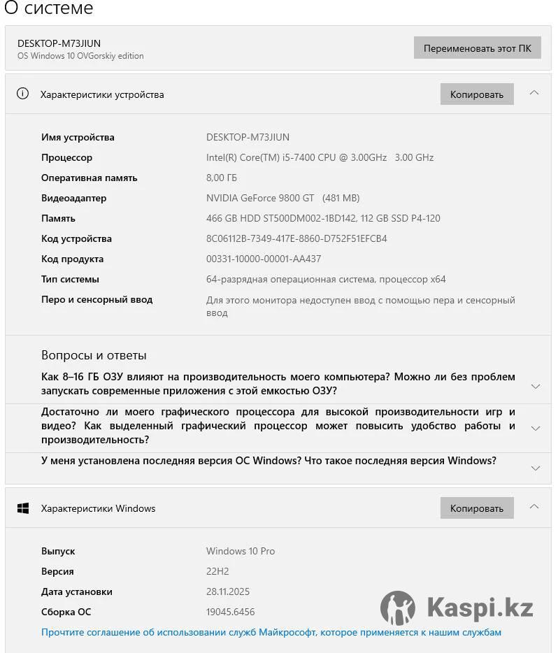 ХАРАКТЕРИСТИКИ: Материнская плата - ASRock B150M-HDS Видеокарта - GIGABYTE GeForce 9800 GT (512mb) Процессор - Intel Core i5-7400, 3.50 mhz Оперативная память - Apacer 8gb DDR4 (1 плашка) Память - SSD 120 (Виндовс 10 с активацией / HDD 500gb Монитор - Samsung S19D300NY Клавиатура и мышь Почистил обновил термопасту. Базовую классику игр тянет. Но нынешние уже нет. В доте 2 норм (80-100 фпс) Нужна будет отдельная колонка (у меня нету, я использовал наушники) Могу заранее установить нужную программу ( игру, офис и.т.д) Комп моей девушки, собираюсь продать его и купить ей ноут. Обмен можете не предлагать так как, ноут уже нашел. Можете приехать и проверить при покупке у меня дома.