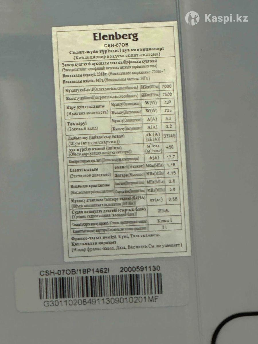Каспи Рэд, рассрочка. СМОТРИТЕ ВСЕ МОИ ОБЪЯВЛЕНИЯ. Кондиционер Elenberg CSH-07QB — выгодное решение для прохладного лета! ❄️. Все трубки идут в подарок ничего не докупаете. Создайте комфорт в доме или офисе за пару минут! Надежная сплит-система Elenberg обеспечивает холод и тепло, работая тихо и экономично. ✅ Мощность охлаждения: 7200 BTU — идеально для комнаты до 20–25 м² ✅ Режимы: охлаждение / обогрев ✅ Тихая работа — комфорт даже ночью ✅ Фильтр для чистого и свежего воздуха ✅ Энергоэффективность, класс 1 ✅ Простое управление 📌 Состояние: отличное 📦 Есть все данные и маркировка (см. фото) 🎯 Отлично подходит для квартиры, офиса, магазина