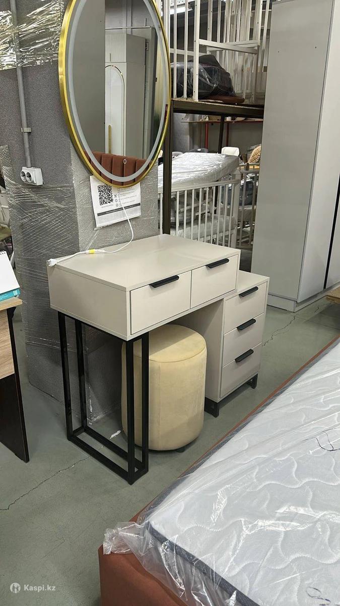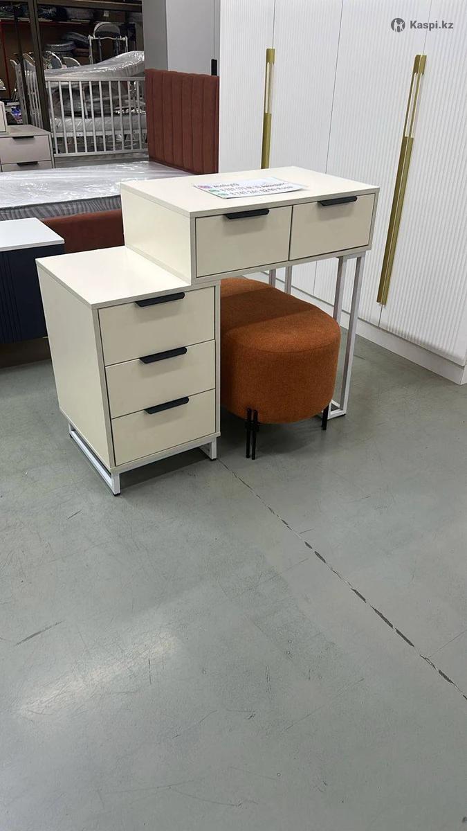 Консольный столик в наличии и на заказ. Материал - ЛДСП Фурнитура - металлическая Размер: 10075см Зеркало - 18.000тг Пуфик- 10.000тг