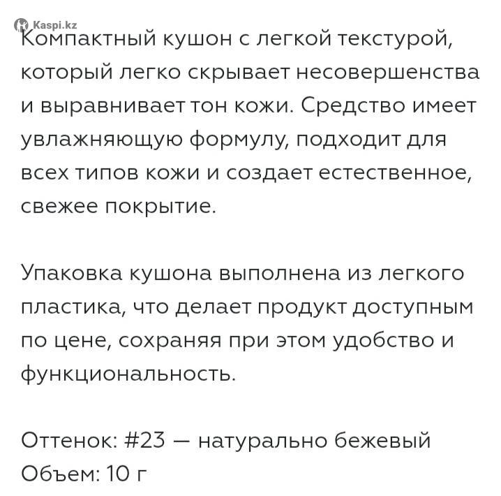 Компактный күшон с легкой текстурой. Который легко скрывает несовершенства и выравнивает кожи. Средство имеет увлажняющий формулу, подходит для всех типов кожи и создает естественное свежее покрытие. Упаковка кушона выполнена из легкого пластика, что делает продукт доступным по цене, сохраняя при этом удобство и фукциональность. Оттенок #23#21 - есть в наличии Объем 10г