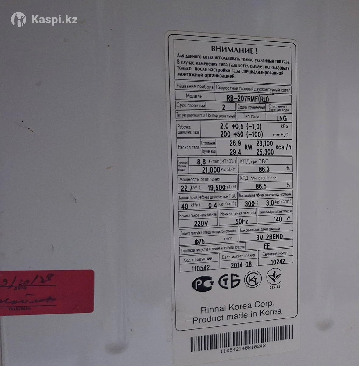 Котел газовый настенный. RINNAI Риннай на 250 квадратов. Продажа в связи с расширением квадратуры. Установлен новый оригинальный теплообменник специалистом Unidom. После установки нового теплообменника законсервирован. Обслуживание фирмой Unidom Алматы. Обслужен и Опломбирован Торг имеется.