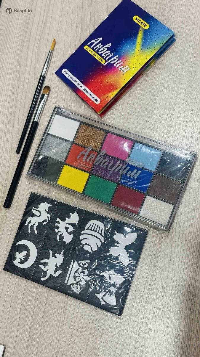 Продажа красок и материалов для аквагрима и боди арта профессионального, гипоаллергенного, не маслянного. В наличии белый и черный цвет, набор из 15 цветов(1е фото) Палетка 15 цветов от 4800 тг Черный и белый цвет 5500 тг 32гр Краски, стразы, блестки, глиттер тату, трафареты, кисти. Переходите на страницу и смотрите! Смотрите там цены и какие краски есть в продаже!