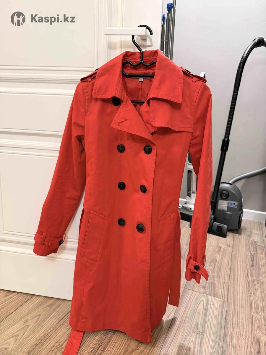 Классический двубортный тренч ярко-красного цвета. Застежка на пуговицы, пояс, карманы, декоративные элементы на рукавах. Универсальная модель для межсезонья. Состояние хорошее.