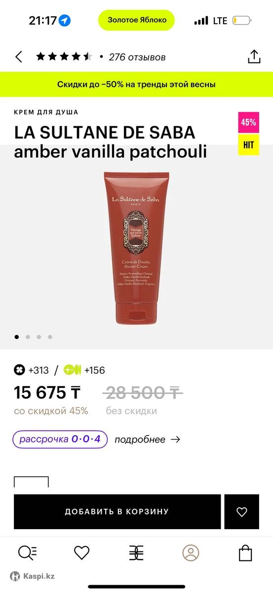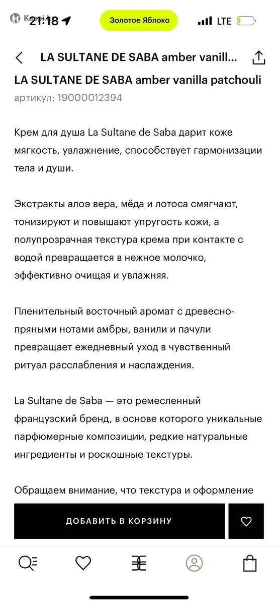 Случайно купила гель для душа вместо крема с Золотого яблока, чек имеется, абсолютно новый, не использованный. Описание: Крем для душа La Sultane de Saba дарит коже мягкость, увлажнение, способствует гармонизации тела и души. Экстракты алоэ вера, мёда и лотоса смягчают, тонизируют и повышают упругость кожи, а полупрозрачная текстура крема при контакте с водой превращается в нежное молочко, эффективно очищая и увлажняя. Пленительный восточный аромат с древесно-пряными нотами амбры, ванили и пачули превращает ежедневный уход в чувственный ритуал расслабления и наслаждения. La Sultane de Saba - это ремесленный французский бренд, в основе которого уникальные парфюмерные композиции, редкие натуральные ингредиенты и роскошные текстуры.