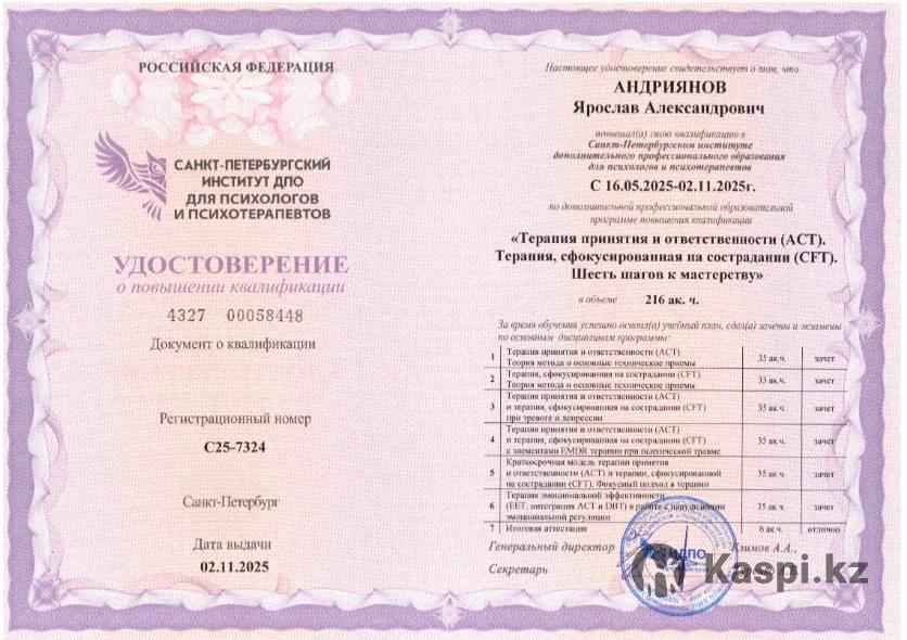 Здравствуйте! Меня зовут Ярослав Андриянов, я - мужчина и дипломированный кризисный клинический психолог. 🔴 Помогают справиться с депрессией, тревогой и сопутствующими проблемами 🔴Сопровождаю психологические кризисы, в связи с утратой, горем и тяжелыми диагнозами 🔴Работаю со срывами адаптации при развитии карьеры, смене места жительства или семейного статуса, конфликтами в семье, кризисами брака/среднего возраста, сопровождением горя/утраты близких 🔴Помогаю разобраться в сложных, безвыходных ситуациях в семейных и профессиональных отношениях ❌НЕ работаю с: - наркотической и алкогольной зависимостями - детьми и подростками - парами 💪Методы моей работы: когнитивно-поведенческая психотерапия, трансактный анализ, ACT, CFT, экзистенциальный подход и клиническая психология (никакой эзотерики, астрологии и т.п.) 🥇Практику веду в команде с врачами-психотерапевтами, психиатрами и клиническими психологами (профессора, кандидаты медицинских и биологических наук). Поэтому, если в процессе работы мы выявим сопутствующие проблемы, обязательно перенаправлю вас в надежные и бережные руки. 👨💻Работаю онлайн и оффлайн в Алматы, на русском языке. 💲 Стоимость - 20 000 тенге в час (60 мин), пакет из 5 консультаций - 75000 (действует 2 месяца). Оффлайн +5000 (проходит в центре Алматы) Принимаю так же в рублях и долларах по курсу Нацбанка Казахстана. 🎓Образование: университет "Туран", г.Алматы (магистратура по клинической психологии), институт психотерапии и клинической психологии им Б.Д. Карвасарского, г.Санкт-Петербург (повышение квалификации по КПТ и кризисной психотерапии), Ассоциация когнитивно-поведенческой психотерапии, г.Санкт-Петербург (повышения квалификации по КПТ), Санкт-Петербургский институт ДПО (повышение квалификации по ACT, CFT)