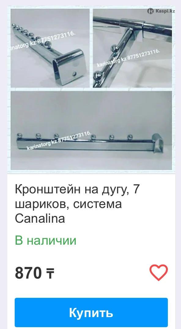 Дуга на систему каналина 60 см, 3500 тг есть 8 шт Кронштейн на квадратную трубу 7 Шариков, 1 шт 500 тг Кронштейн на душу прямой 7 Шариков, 1 шт 350 тг Крепление в пекинский профиль Каналина ( черепашки) 1 шт 350 тг На экономпанель Корзина металлическая 7 шт 350 тг за штуку Насадки от 25 до 30 см по 150 тг за штуку