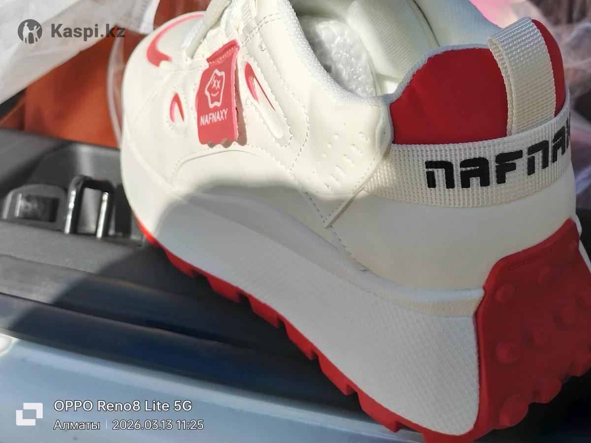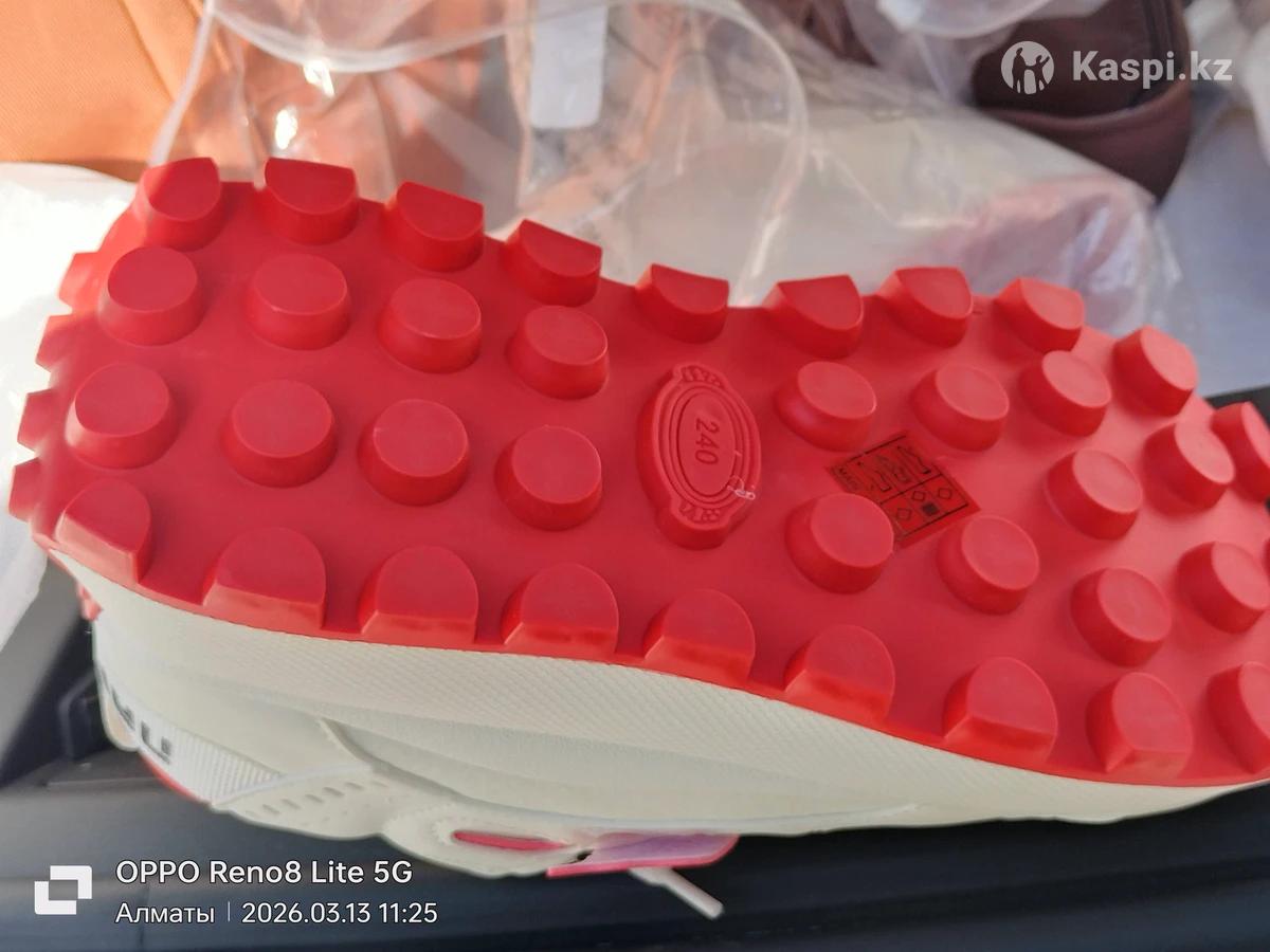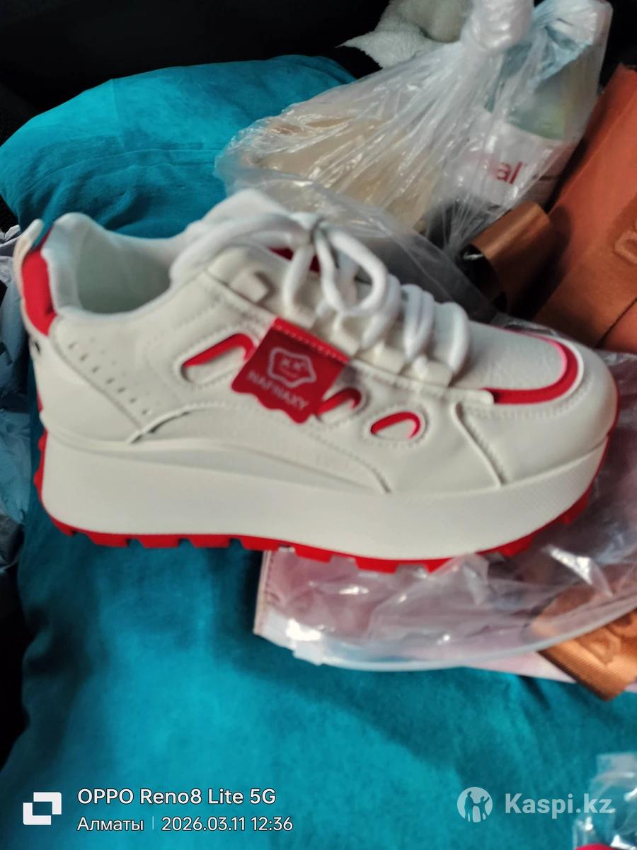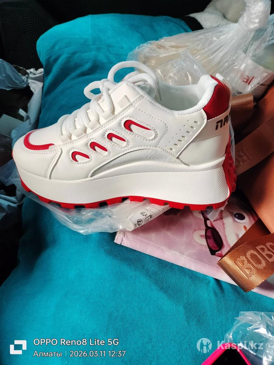 Кроссовки новые белые с красной тонкой окантовкой, на высокой подошве. Размер на 37-38. Надо мерить. Производство Китай( фабричное) Доставка по городу бесплатно.