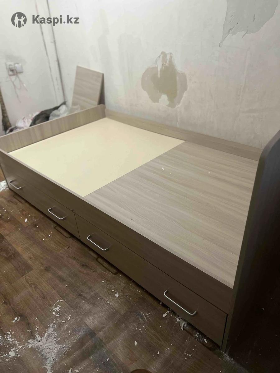Кровать 1,5 с матрасом цвета светлый орех, снизу имеются задвижки для вещей