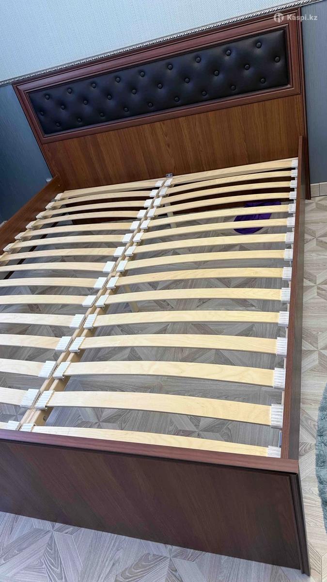 • Прочный деревянный каркас – долговечность и устойчивость конструкции • Основание из ламелей – равномерная поддержка для комфортного сна • Мягкое изголовье с декоративной стежкой – элегантный акцент и удобство при чтении или отдыхе • Размер: стандартная двуспальная (для матраса 160×200 см), снаружи 170х200 • Состояние: аккуратное, без серьезных повреждений