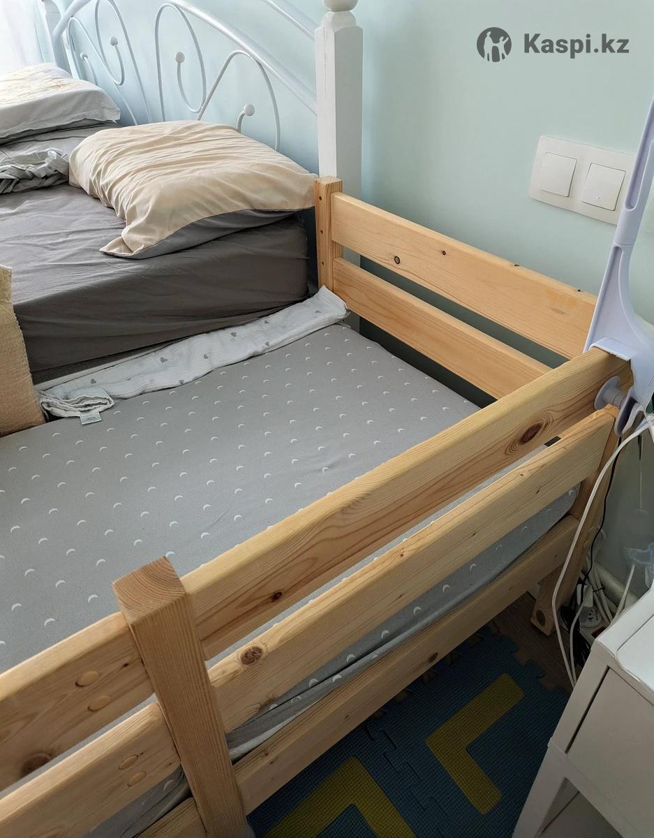 Кровать деревянная с хорошим дорогим матрасом, в отличном состоянии. Матрас 6 см кокосовая койра, 6 см холлкон. Кровать массив сосны. На фото видно, что обклеена пленкой - это что бы слышать что ребенок проснулся, пленку можно снять. Мы использовали как приставную кроватку. В подарок 2 непромокаемых наматрасника: -bamboo-waterproof--60x120-belyi-100800174/?ref=shared_link Кровать для новорожденного SleepBaby 120х60 из массива сосны Детский матрас PLOOMABABY MAGIC 1 ортопедический 120х60х12 кокос-холлкон ЖК Ривьера, метро Сайран, ТЦ АДК