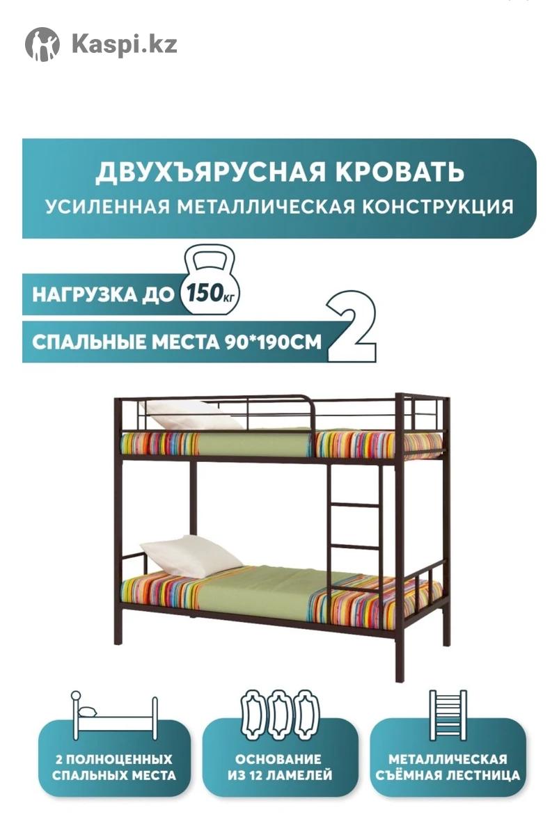 Кровать двухъярусная 2 шт. Состояние идеальное. Покупали как защиту от землетрясения. Дети спали только на нижних ярусах. Качество отличное, очень прочный металл. Характеристики кровати указаны на фото. Каждая по 90000 тг