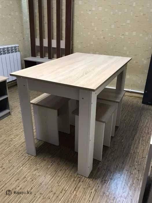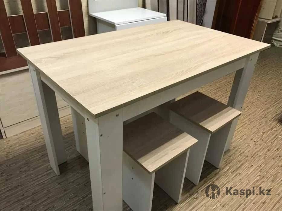 Столы кухонные в комплекте с табуретками. Изготовлены из качественных материалов. Материал: ЛДСП, кромка ПВХ Цвет: в ассортименте Табуретки - стандарт. Изделия НОВЫЕ Всё с лёгкостью вмещается в легковой автомобиль.