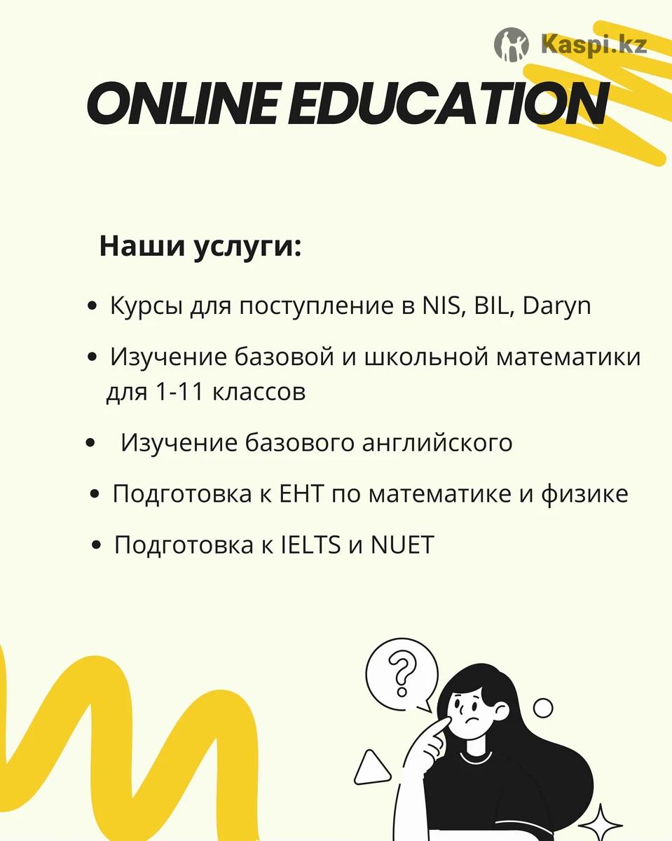 Собираем группы для онлайн обучения В группе не более 5 человек Обучение проходит онлайн по платформе Google Meet, Zoom. Занятие 3-4 раза в неделю Наши услуги: •Курсы для поступление в NIS, BIL(KTL) •Изучение базовой и школьной математики для 1-11 классов •Изучение базового английского •Подготовка к ЕНТ по математике и физике •Подготовка к IELTS и NUET Price(Цена): • Стоимость обучение составляет от 20.000 до 50.000 тенге в месяц в зависимости от вашего выбора • Стоимость двух часового урока от 2 до 6 тысяч тенге • Индивидуальные уроки также присутствуют по вашему выбору. Обучение проходит с выпускниками Назарбаевского Университета и Назарбаевского Интеллектуального Школы