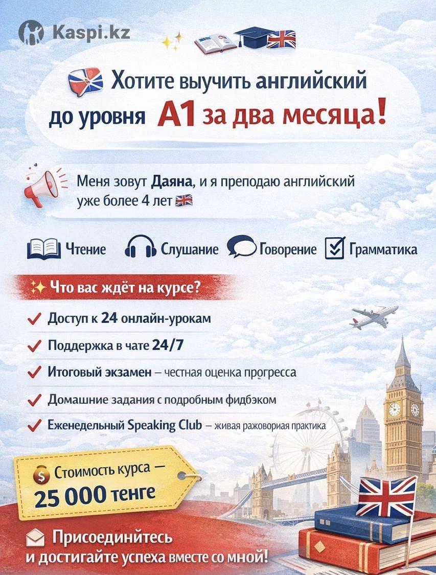 📚 Хотите выучить английский до уровня A1 за два месяца? Меня зовут Даяна, и я преподаю английский уже более 4 лет 🇬🇧 Моя уникальная методика поможет вам развить ключевые навыки: 📖 чтение 👂 слушание 🗣 говорение 📌 грамматика ✨ Что вас ждет на курсе? 🔹 Доступ к 24 онлайн‐урокам 🔹 Поддержка в чате 24/7 🔹 Итоговый экзамен — честная оценка прогресса 🔹 Домашние задания с подробным фидбэком 🔹 Еженедельный Speaking Club — живая разговорная практика 💰 Стоимость курса — 25 000 тенге. 📩 Присоединяйтесь и достигайте успеха вместе со мной! По всем вопросам — пишите в личные сообщения - 💬