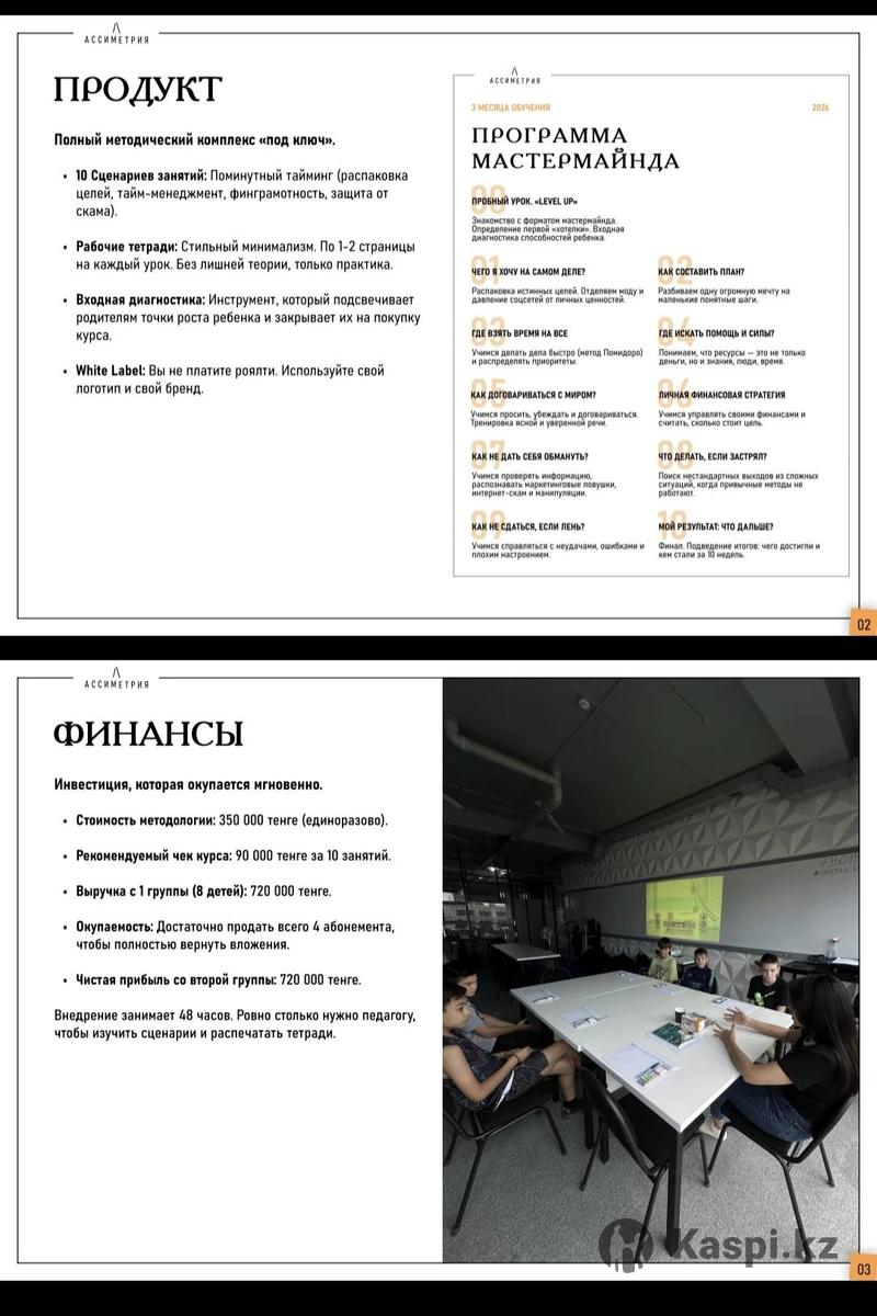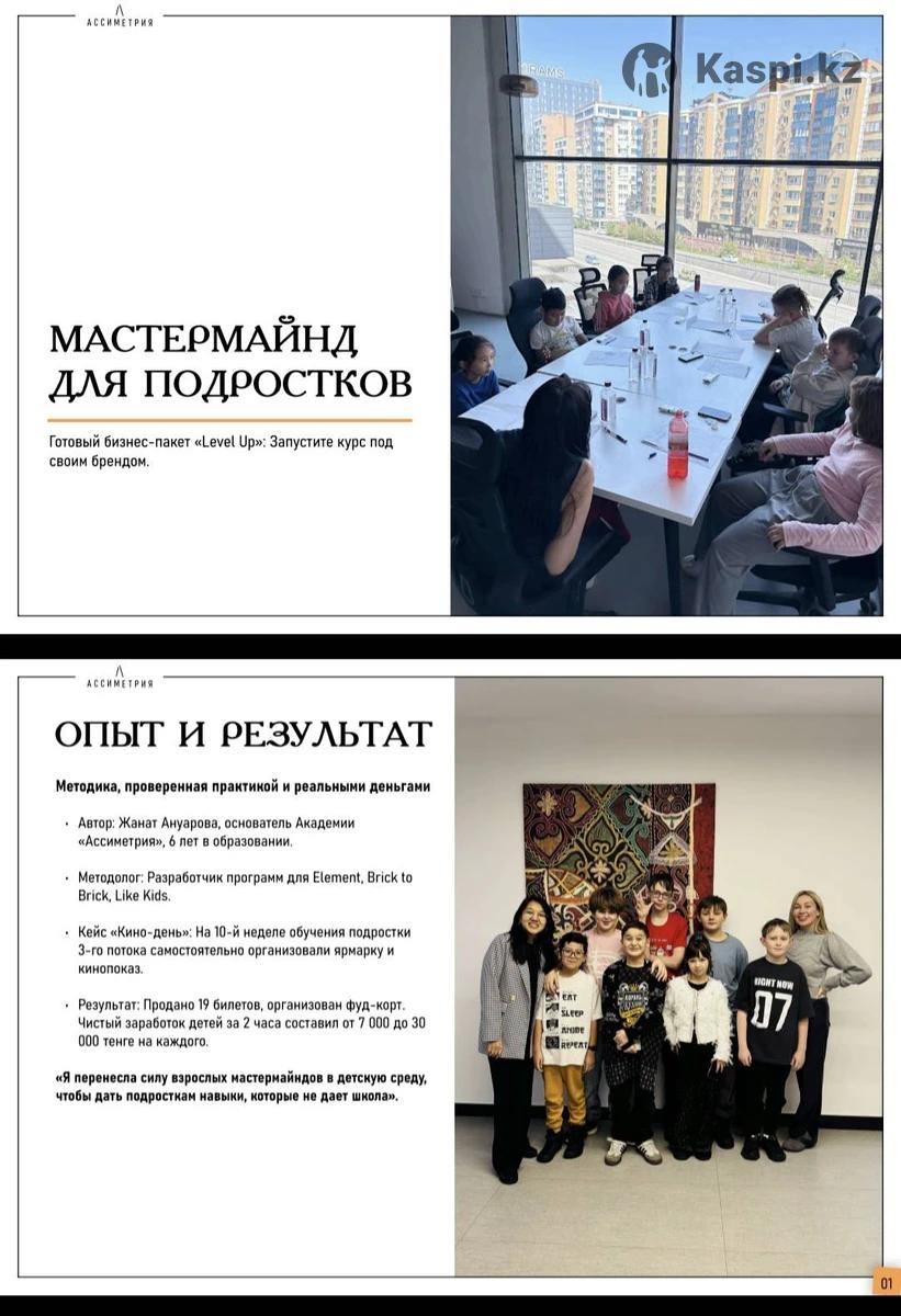 Продаю авторскую методику курса «Мастермайнд для подростков» . Это готовое решение для тех, кто хочет запустить прибыльное подростковое направление, но не имеет времени на разработку. Методика прошла обкатку (3 потока). На последнем потоке дети сами организовали проект и заработали от 7 000 до 30 000 ₸ за 2 часа прямо на выпускном. Что вы получаете в пакете: - Поминутные сценарии: Педагогу нужно просто следовать плану. - Рабочие тетради: Готовые макеты в стиле минимализм. - Инструмент продаж: Умная входная диагностика, которая наглядно показывает родителям дефициты ребенка и закрывает их на покупку курса. - Темы-магниты: Целеполагание, тайм-менеджмент (Помидоро), финансовая грамотность и кибербезопасность. Ваша выгода: - Экономия: Более 150 часов на разработку программы и дизайн. - Формат White Label - работаете под своим брендом без роялти и процентов с продаж. - Вложения возвращаются уже с 4-го проданного абонемента. Продаю ограниченное количество копий, чтобы не создавать конкуренцию в одном районе.