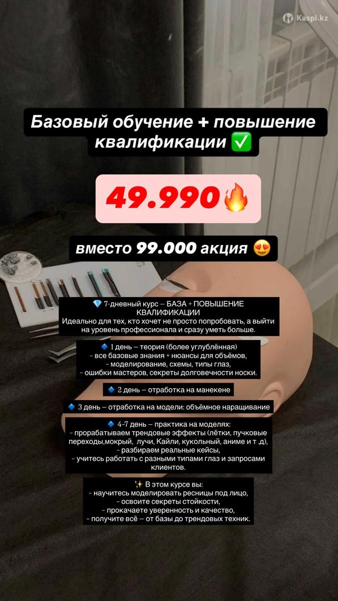 ОФФЛАЙН КУРС В АСТАНЕ Индивидуальный, в любое время и дату! ! ! Мы стараемся для Вас! А Наш курс доступен каждой! «МАСТЕР ЛЭШМЕЙКЕР» КУРС ПО НАРАЩИВАНИЮ РЕСНИЦ ДЛЯ ТЕБЯ! Мамочка в декрете? Студентка? Незнаешь где найти работу? Хочешь зарабатывать от 400.000 в месяц? Устала работать на кого-то? Тогда тебе сюда! Обучение будет проводиться на казахском языке ! Базовый обучение 25000 тг ✅ 3 дня обучение поэтапно 1 день - теория практика 2 день - практика на модели 3день - практика на модели + сертификат Базовый обучение + повышение квалификации 49990 вместо 99990 ✅ Получается 2 обучение по 49990 с подтверждающими сертификатами 😍 7 дней обучения поэтапно 1 день - теория 2 день - практика на манекене 3 день - практика на модели 4 день - работа + теория над обьемом 5 день - работа + теория над эффектами 6 день - секреты каждого мастера + практика 7 день - экзамен + сертификат «Наработка портфолио» Получаете сертификат базового обучение и также повышение квалификации 🥰 Большая часть обучения построена на практике Сможешь расти по карьерной лестнице и зарабатывать до 400.000 в месяц Гибкий график Цена со скидкой 49990тг✅