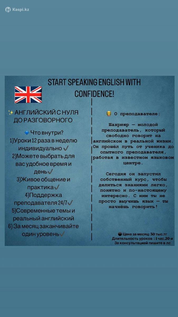 📢 До сих пор не выучил(а) английский? Хватит тратить время на старые и скучные методы и время тратящие курсы! 🚀 Присоединяйся к нашему курсу по английскому языку– это оффлайн-курс английского, который помогает заговорить быстро и уверенно с правильной методикой! 🇺🇸 Или 🇬🇧 Выбирай сам😍 ✅ Разговорный английский без зубрежки ✅ Понимание носителей ✅ Удобное расписание, 100% оффлайн ✅ Реальные фразы и живое общение 🎁 Бонус: Первые 5 учеников на этой неделе получают бесплатный индивидуальный урок!