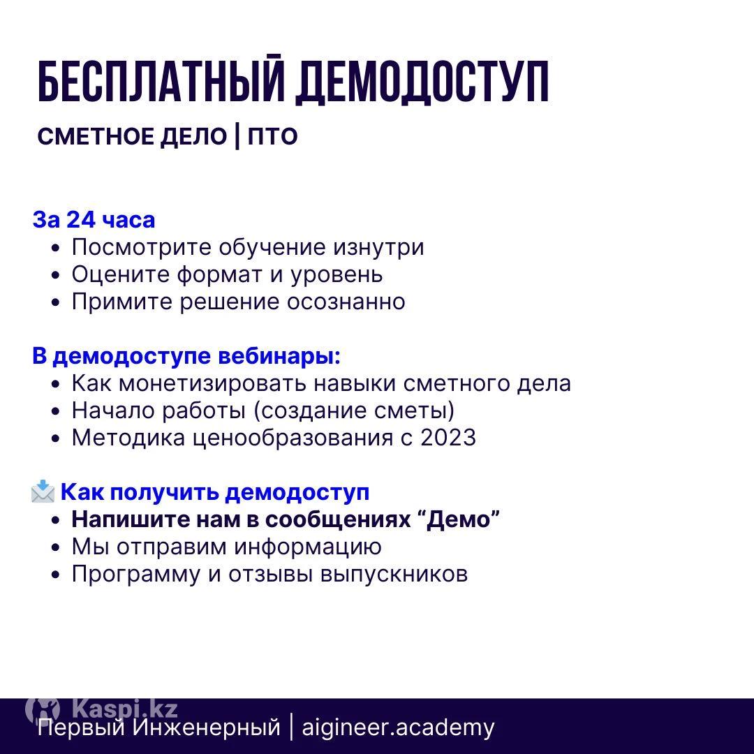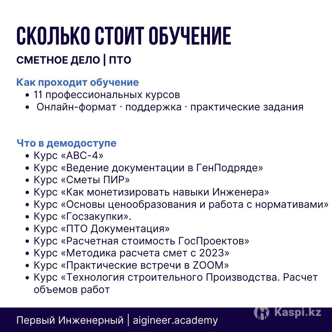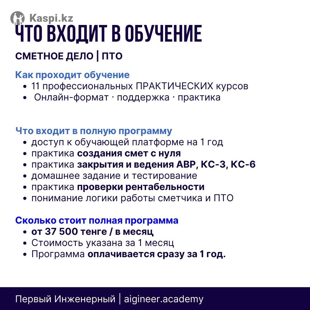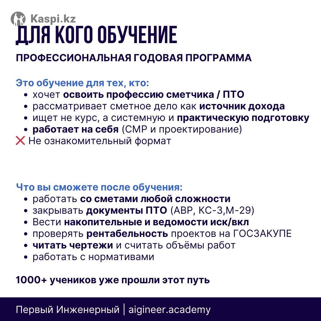 Получите практические навыки с нуля до профессионала. Годовая профессиональная программа из 11 курсов, выстроенных в единую систему. Обучение подойдет тем, кто рассматривает сметное дело как профессию и источник дохода, а не ознакомительный курс. Базовая стоимость комплексной подготовки инженера сметчика/ПТО за годовой доступ от 450 000 тыс. В объявлении указана цена за месяц обучения — от 37 500 тг. Программа практическая и рассчитана на 1 год. За время обучения вы научитесь: — читать чертежи и определять объемы работ — составлять и проверять сметы — работать в программе АВС-4 — закрывать АВР, КС-3, М-29 — работать с проектно-сметной документацией — разбираться в госзакупках и коммерческих проектах Формат обучения — онлайн, с практикой и поддержкой преподавателя. 🔓 Перед покупкой предоставляется бесплатный демодоступ на 24 часа. Для демо доступа напишите ДЕМО в сообщении, мы отправим информацию. Для участников демодоступа действуют акции и спецпредложения.