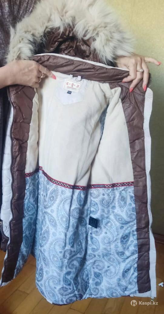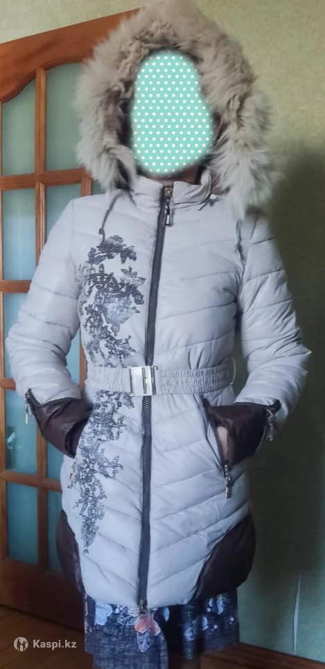 Куртка зимняя на женщину или девушку размер 42-46, нужно мерить. Очень теплая, стильная расцветка, объемный капюшон с красивой опушкой. Пояс с резинкой внутри, пряжка слегка потерта, не сильно заметно, но на замену продаются в швей. маг. На рост 165 длина над коленями.