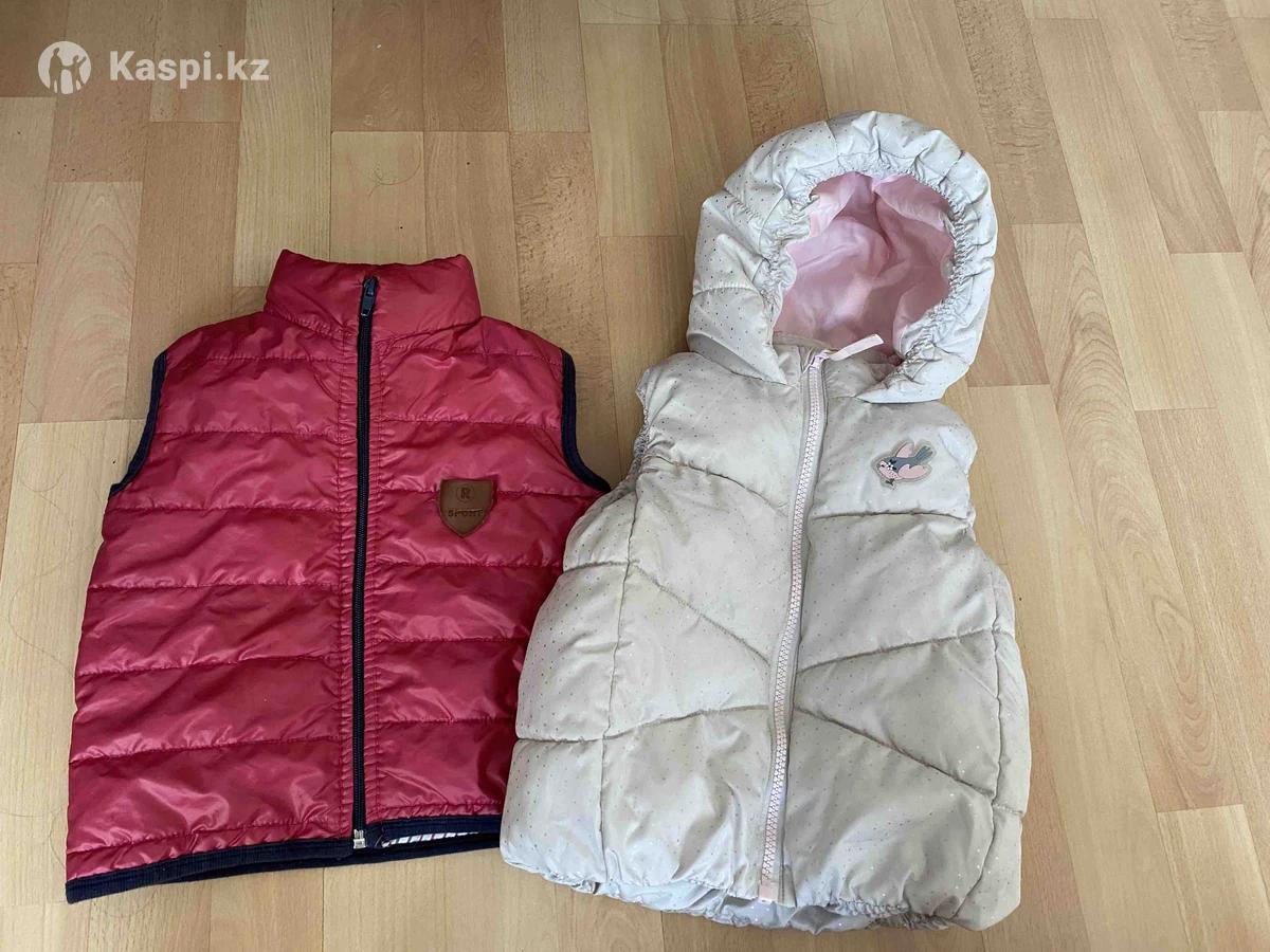 Куртки на весну-осень размер 92-98, жилетки размер 86-92, но можно и на 98. 1 фото. Серо голубая куртка 700 тенге 2 фото. Коричневая куртка H&M 1000 тенге 3 фото. Жилетки по 700 тенге каждая.