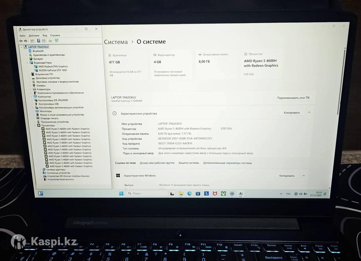 Ассалаумагалейкум! Продаю ноутбук Lenovo Idiapad gaming 3 в отличном состоянии! 10/10 100% Самый тихий ноутбук своей версией! Корпус прочный защищен от царапин! Все ножки и эмблема-наклейка на месте! Зарядка держит очень хорошо 4-5 часа! Включение 5-7 секунд! Цвет: Хомиленовый темно-синий! В комплекте: Ноутбук, зарядка оригинал, Шнур питания! +Подарок Новый Кожа Сумка бренд , Беспроводной мыши Logitech, коврик для ноутбука и для мыши! Мощный Характеристика: Windows 11 pro Процессор: Ryzen 5 4600H 3.00 ghz + турбо BOOST! Ядро: 6×12 логических потока! Память: Ssd 512 GB NVME M2 новый поколение! Оперативный Память ОЗУ 8GB есть еще один слот можно до 32 gb! Видеокарта: NVIDIA GTX 1650TI 4 GB RGB Клавиатура с подсветкой 3 положение и отпечатка пальцы есть! Экран: IPS 1920x1080 Full HD разрешением, Графика: 144hz! Все современные порты имеет: TYPE-C порт, USB 3.0 2, USB 2.0 1, HDMI, LAN, гнездо для наушник и WiFi, Bluetooth, веб-камера защита и тд... Мощный ноутбук, очень редко включено, в нем еще не играли! Цена в магазине начинается от 450К до 600К. Обмен не интересует только продажа! Просто так не беспокоить!