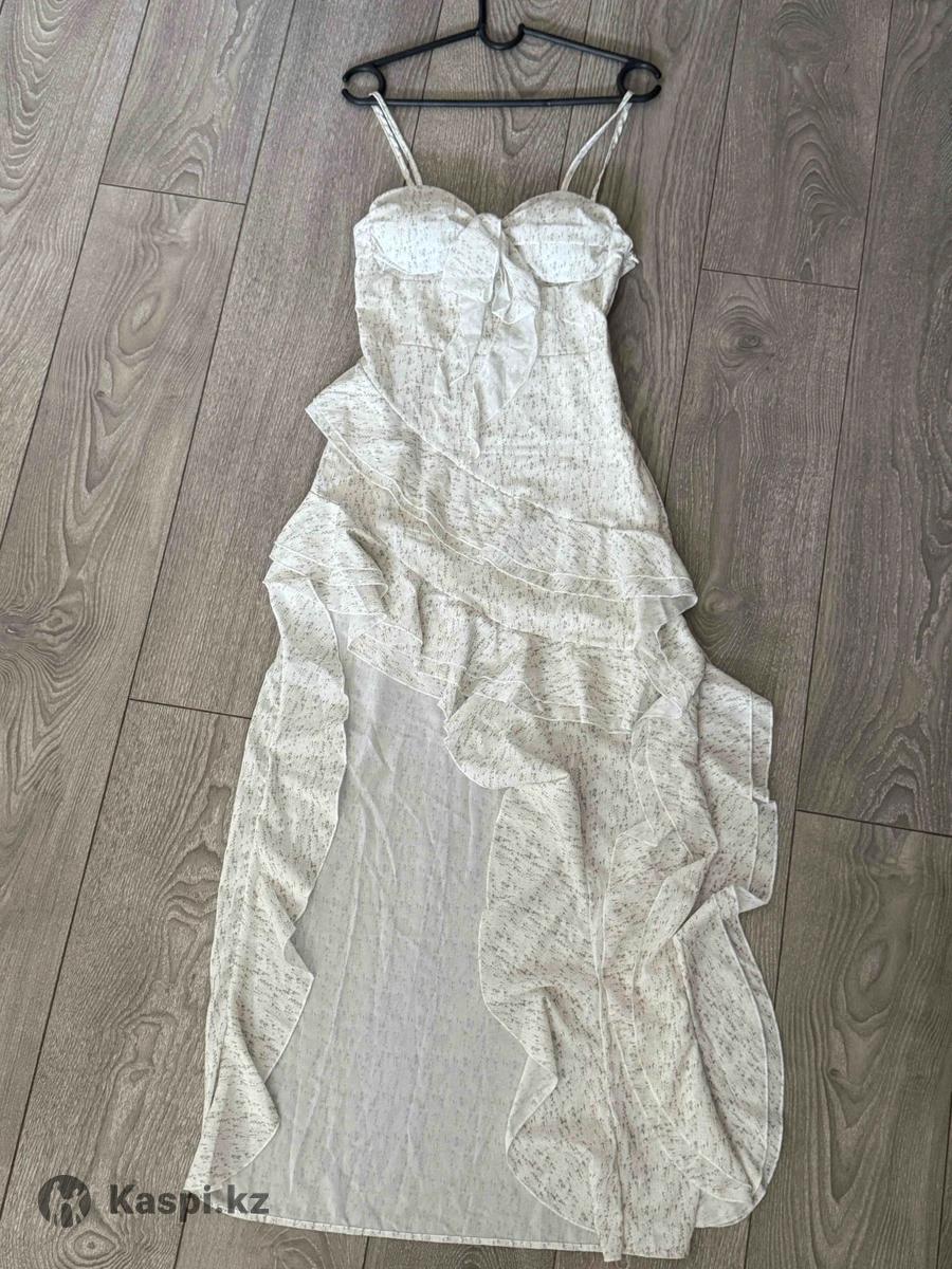 белое платье с зелеными цветочками. размер S. с разрезом. есть подкладки. лямки регулируются