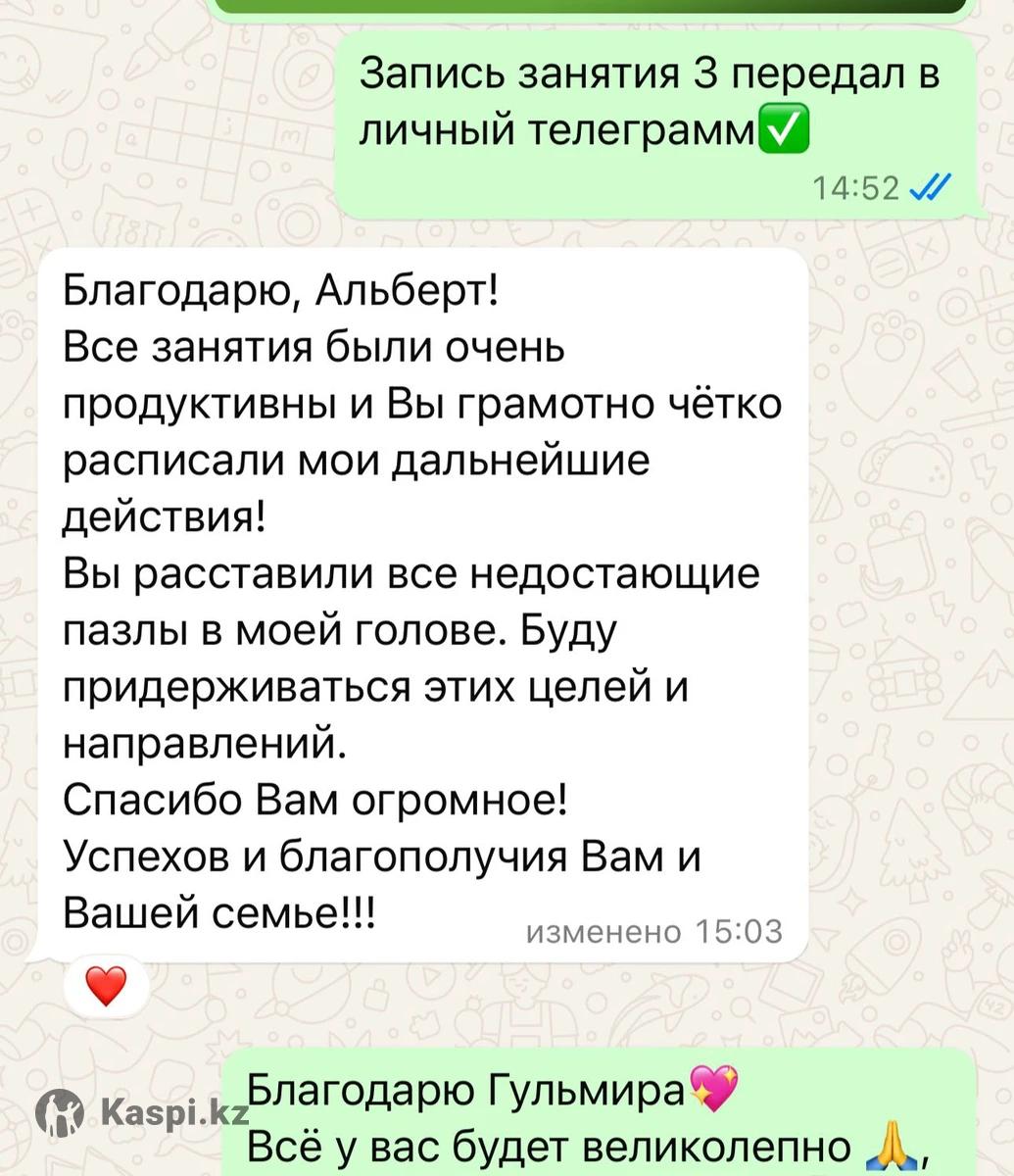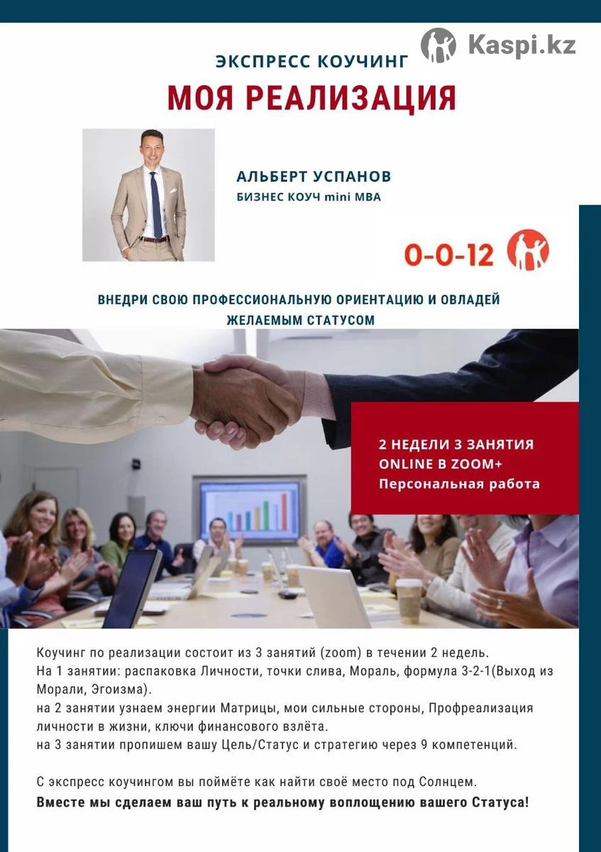 Твоя цель-Достичь гармонии и успеха в жизни. Почувствуйте внутренний покой и уверенность. Представьте себе, как вы уверенно движетесь к своим целям, наслаждайтесь гармоничными отношениями и чувствуете внутреннюю энергию. Меня зовут Альберт Успанов, цифровой консультант по личностному росту и бизнесу, Бизнес коуч mini MBA с большим опытом работы с 2020 года. Экспресс коучинг на карьеру, бизнес это 3 встречи, Zoom. Запись остается у вас. Встреча-занятие1: Осознание себя и распаковка Личности. Триггеры с родителями, близкими. Выход из морали чз формулу 3-2-1. Домашнее задание: как «Я делю на умный/тупой, честный/нечестный и тд» + Дисциплина тела. Встреча-занятие 2: Анализ Матрицы, Предназначения, формула Успеха, Отрасли сферы деятельности, ключи финансового взлета. Домашнее задание + Дисциплина тела. Встреча-занятие 3: Постановка цели и стратегии. Пропись ПЛАНА достижения цели, желаемого статуса через 9 компетенций. Рекомендации по ежедневной практике для удержания энергии на высоком уровне. Финальная настройка плана и ответы на вопросы. Поддержка 2-й недели. Формат: онлайн, zoom, оффлайн встреча в рамках Алматы. Время: 3 встречи в течении недели - 10 дней. Вариант Каспий 0-0-12.