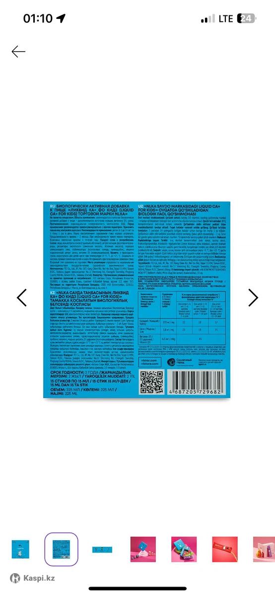 Liquid Ca+ for kids – табиғи шырын дәмі бар, ыңғайлы порциялық стиктегі сұйық түріндегі иновациялық кальций. Липосомалық технологияның арқасында өнімнің биожетімділігі жоғары, ал D3 дәрумені мен мырышпен күшейтілген формуласы кальцийдің барынша сіңуін және өсіп келе жатқан ағзаны кешенді түрде қолдауды қамтамасыз етеді.Баланың жасына байланысты ұсынылатын дозаны «Құрамы» бөлімінен қараңыз.