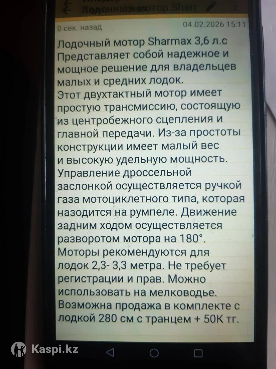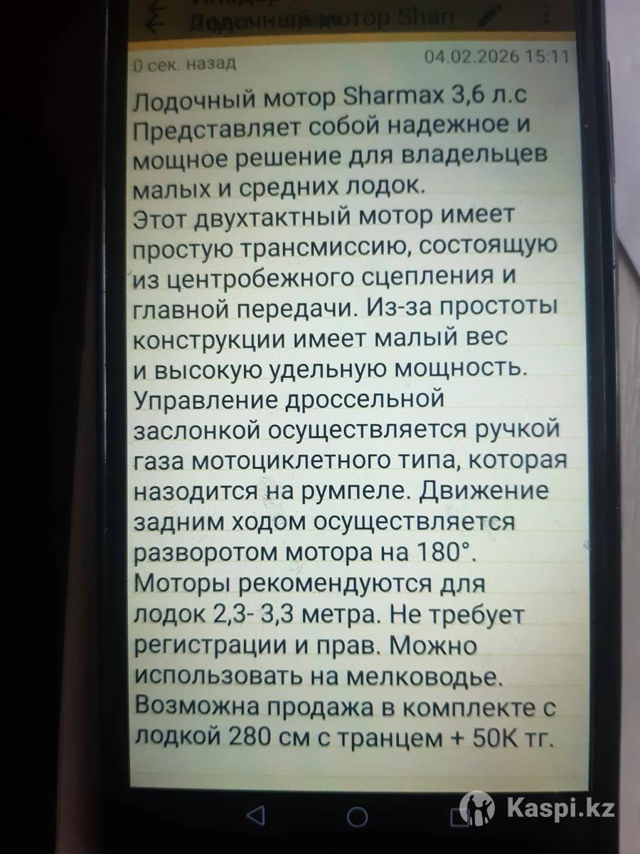 Продам надувную резиновую лодку длина -280см ширина-132см кокпит длина -195см кокпит шир-62см диам.борта-35см цена50 000т Продам лодочный мотор Sharmax 3.6 2-х контактный цена 100 000т
