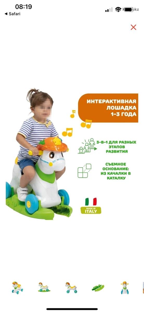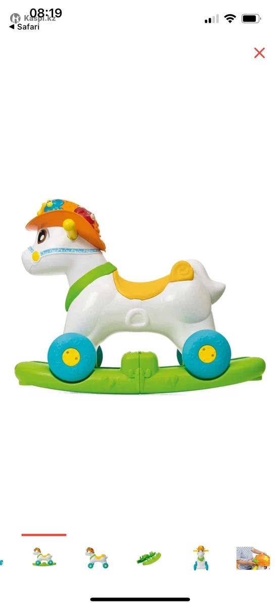 Лошадка-каталка CHICCO Baby Rodeo Первая лошадка-качалка, с которой можно играть, как с настоящим животным! Лошадка-качалка Baby Rodeo предназначена для деток с 12 месяцев. Когда ребенок кормит лошадку, она издает ржание. Когда малыш гладит лошадку, она двигает глазками и весело ржет. 3 режима игры: Качалка. С практичной съемной базой. Теперь можно качаться в полной безопасности! Едем верхом на лошадке. Достаточно снять базу, и малыш может свободно передвигаться на лошадке по дому и играть в безопасности! Электронный игровой центр. 2 кнопки на корпусе игрушки активируют световые и звуковые эффекты. Обними и покорми лошадку. Когда ты ее гладишь, она начнет ржать и двигать глазками .