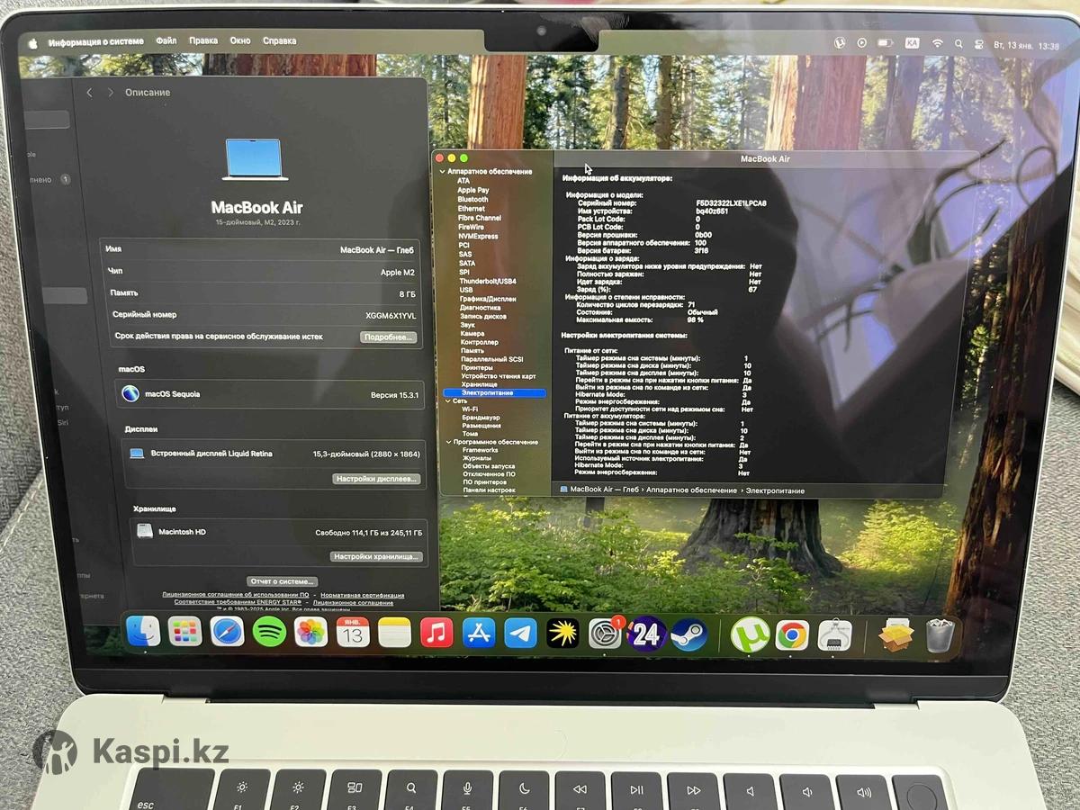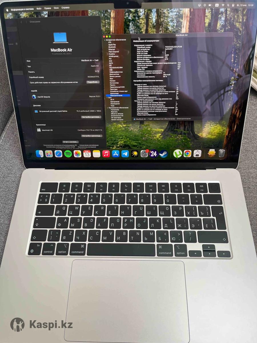 MacBook Air 15 дюймов экран Процессор M2 2023 года 8/256 Максимальная емкость аккумулятора 98% Количество циклов перезарядки 71 Ноутбук в идеальном состоянии имеется коробка и зарядка ноутбуком почти не пользовались Есть небольшой торг Есть рассрочка 12 месяцев но будет дороже на 18%