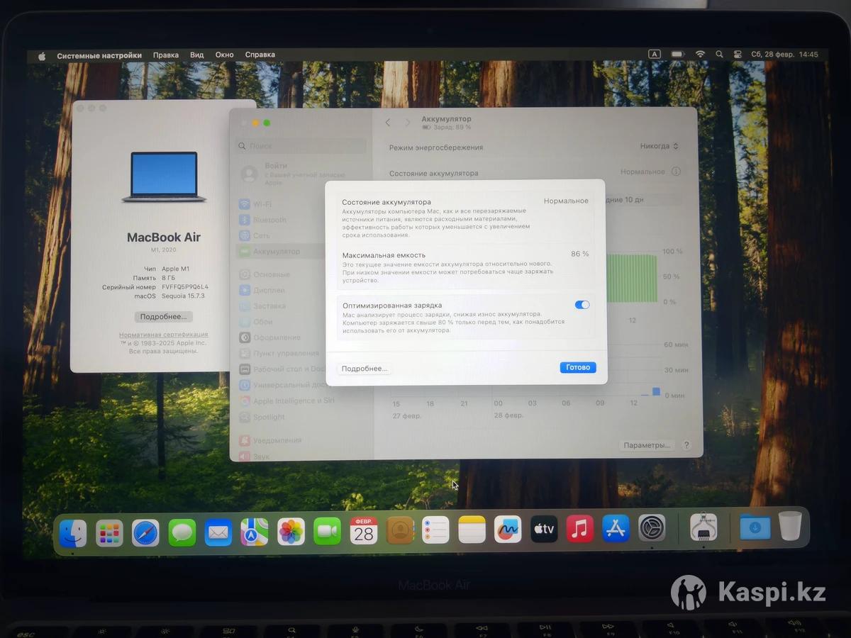 Продам MacBook Air на процессоре Apple M1 (2020). Использовался аккуратно, технически полностью исправен. Не вскрывался, не ремонтировался. Состояние: - Есть косметические царапины на корпусе и следы от наклеек (на работу не влияют) - Без сколов и трещин - Экран без битых пикселей и пятен - Клавиатура оригинальная RU, подсветка работает - iCloud отвязан - Перед продажей выполню полный сброс Характеристики: - Apple M1 - 13.3” Retina - 8GB RAM / 256GB SSD - Цвет Space Gray - Батарея: 86% - Держит до 10 часов в обычном использовании Любые проверки на месте