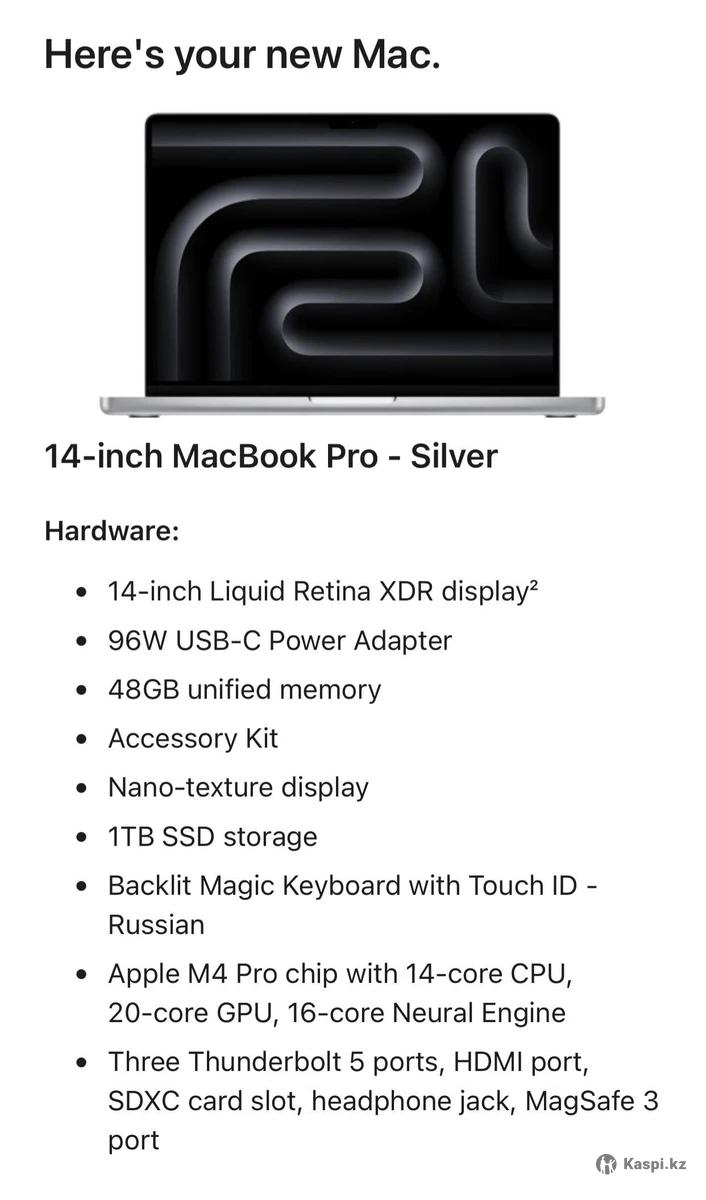 Этот MacBook Pro — не просто ноутбук. Это инвестиция в вашу продуктивность и творчество. Он создан для профессионалов, чье время — самый ценный ресурс: для программистов, видеомонтажеров, 3D-дизайнеров, музыкантов и фотографов. Для всех, кому нужна абсолютная мощность, чтобы воплощать свои самые смелые идеи в жизнь без малейших задержек. Если вы устали ждать рендеринга, компиляции или отклика программ — это ваш инструмент. Ключевые характеристики и что они вам дают: - Процессор: Apple M4 Pro (14-core CPU, 20-core GPU) — Мгновенный отклик в самых требовательных задачах, от монтажа 8K-видео до работы с нейросетями. - Оперативная память (RAM): 48GB unified memory — Забудьте о "тормозах". Держите открытыми десятки вкладок, Docker, Photoshop и Final Cut одновременно. Система будет летать. - Накопитель (SSD): 1TB — Достаточно места для всех ваших проектов, исходников и программ. Скорость чтения и записи запредельная. - Дисплей: Liquid Retina XDR 14.2" с нанотекстурным стеклом — Идеально для работы у окна или под ярким светом. Никаких бликов, только чистый, идеально откалиброванный цвет. Ваши глаза скажут вам спасибо. - Клавиатура: Оригинальная, с заводской русской раскладкой — Никаких компромиссов с гравировкой. Просто откройте и работайте. - Комплектация: Полная заводская (ноутбук, кабель MagSafe, адаптер питания 96W USB-C). - Серийный номер: LXP79Y3WMY Состояние, Гарантия и Происхождение: - Ноутбук был куплен в официальном онлайн-магазине Apple Store USA 25 августа 2025 года. - Имеется официальный чек (invoice) для подтверждения. - Коробка НЕ ВСКРЫВАЛАСЬ, заводские пломбы на месте. - Официальная ограниченная гарантия Apple действует до 27 августа 2026 года. - Полная прозрачность: При встрече я готов показать официальный чек от Apple с серийным номером, который совпадает с номером на коробке, чтобы вы были на 100% уверены в происхождении и чистоте сделки. Пожалуйста, прочтите перед тем, как писать или звонить: - Цена: $3000. Торг и обмен не интересует. - Оплата: Только наличными (USD или KZT по курсу на момент сделки). Переводы на банковские карты не принимаются. - Встреча: Проверка и покупка в безопасном общественном месте с доступом к банкоматам. - Связь: Предпочтительно через сообщение. Из-за работы не всегда могу отвечать на звонки. Пожалуйста, пишите — я отвечаю быстро. - Доставка: Через курьерские службы либо сам передам лично вам в руки за небольшую плату. Если вы ищете бескомпромиссный профессиональный инструмент для серьезной работы и цените свое время и деньги — это предложение для вас. Вы получаете абсолютно новый ноутбук с гарантией, с русской клавиатурой и по цене ниже, чем в магазине. Кроме того, занимаюсь заказом другой техники из США. Если ищете конкретную модель, которой нет в наличии — напишите мне, я рассчитаю для Вас итоговую стоимость и сроки доставки (в среднем 3-4 недели). Всем добра и благополучия!