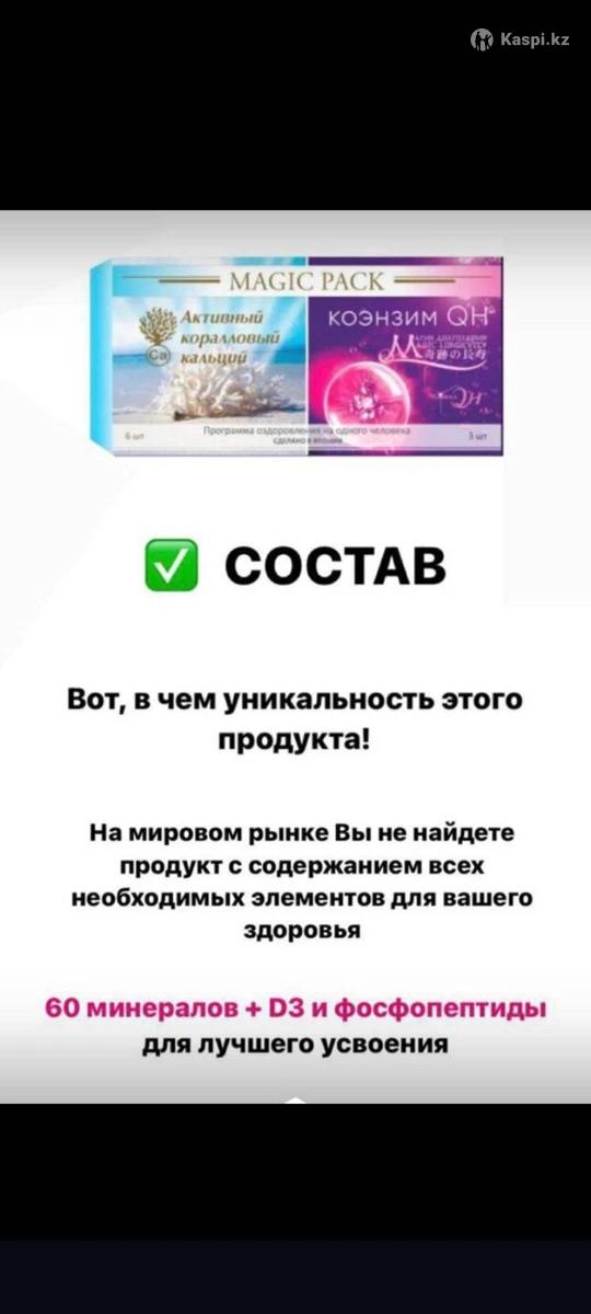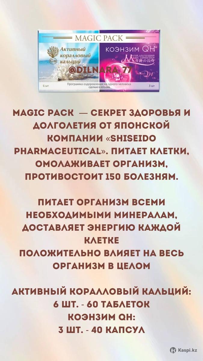 MAGIC PACK - программа оздоровления рассчитанная на 6 месяцев здоровой жизни. Комплекс укрепляет иммунитет, дает энергию, способствует очищению организма и похудению, наполняет вас витаминами и минералами, также лечит более 150 заболеваний в том числе хронических. 100% гарантия качества, производство Япония Shiseido. Активный коралловый кальций содержит около 60 макро- и микроэлементов, которые усиливают его полезные и оздоровительные свойства. Главное — усвояемость кальция организмом достигает 97%. Коэнзим QH с лактобактериями поддерживает правильную работу сердца, особенно при повышенных физических нагрузках. Кроме того, они способствуют снижению веса, разглаживанию морщин, уменьшают дряблость кожи и замедляют процессы преждевременного старения. Стоимость в $ с доставкой на дом.