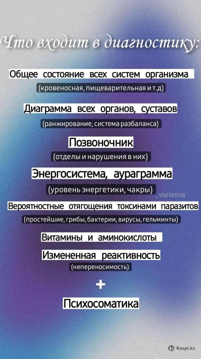 Центр Путь Здоровья ИП Бумбуриди К .Е Государственная лицензия номер: 17011483. Предлагает свои услуги: остеопатия, мягкие мануальные техники, кинезиология, висцеральный, лимфодренажный, P-DTP- работа со шрамами, правка анланта 1-й шейный позвонок. Рефлекторная гимнастика, ОФК на базе "детских примитивных рефлексов", ЛФК, энергопсихология, массаж. Биорезонансная диагностика организма: паразиты, вирусы, бактерий, грибы и т.д Диагностику и лечение проводят: Бумбуриди Бэлла Владимировна врач невропатолог,остеопат, мануалист, кинезиолог, P-DTR, психолог стаж работы 20 лет Сатмагамбетов Мурат Калдыбаевич мануалист, кинезиолог. стаж 9 лет. Мануальная медицина (мануальная терапия) – это научное направление и область медицинской практики, представляющее собой систему ручных лечебных приемов, с помощью которых можно достаточно эффективно избавиться от заболеваний позвоночника, суставов, мышечного и связочного аппарата, внутренних органов, костей черепа. Особая ценность этого метода заключается в том, что он позволяет решать многие проблемы, которые другими медикаментозными и даже хирургическими средствами вылечить невозможно. Мануальная терапия — это комплекс лечебных приемов, заключающийся в ручном воздействии на анатомические структуры тела для ликвидации выявленных ограничений с целью их освобождения от функциональных блоков и восстановления циркуляции жидкостей для создания оптимального двигательного состояния человека, ведущего к улучшению качества его жизни. Искривление позвоночника, сколиоз, нарушение осанки, смещение позвонков, искривление таза, ограничения подвижности позвоночника. Лечение: боль в пояснице, шее, спине, межреберная невралгия, радикулит, боли в суставах, прострелы в пояснице, головокружение, головные боли, шум в ушах. Лечение остеохондроза, отложения солей. ПОКАЗАНИЯ ДЛЯ ПРОВЕДЕНИЯ МАНУАЛЬНОЙ ТЕРАПИИ: 1. Остеохондроз позвоночника 2. Грыжи межпозвоночных дисков 3. Протрузии межпозвоночных дисков 4. Боль в позвоночнике 5. Боль в суставах 6. Боль в мышцах 7. Нарушения осанки (сколиоз, лордоз, кифосколиоз) 8. Смещение (соскальзывание) позвонков - стабильный листез и нестабильный листез, спондилолистез 9. Нарушения функции и положения стоп (плоскостопие, боли в стопе и т.д.) 10. Артриты и артрозы с деформацией и без деформации (на определенных стадиях развития) 11. Заболевания нервно-сосудистой системы ( ВСД - вегето-сосудистая или нейро-циркуляторная дистония, синдром хронической усталости или повышенная утомляемость) 12. Целый ряд иных состояний и заболеваний костно-мышечной системы и внутренних органов.
