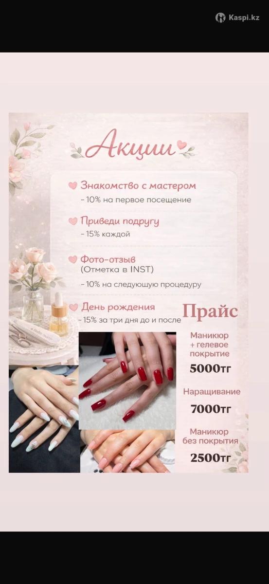 Маникюр | Гель-лак | Наращивание ногтей Здравствуйте! Я мастер маникюра, работаю аккуратно и с любовью к своему делу Приглашаю девушек на красивый и ухоженный маникюр по доступным ценам. Мои услуги: •аппаратный маникюр 2500тг •Покрытие гель-лаком (однотонное, дизайн, френч) 5000тг •Укрепление ногтей базой / гелем 5500тг •Наращивание ногтей (разные формы и длины) 7000тг Поченьу стоит выбрать меня? Аккуратность и стерильность инструментов Индивидуальный подход к каждой клиентке Современные материалы, которые держатся долго Доступные цены идеально, чтобы сэкономить и при этом выглядеть стильно Принимаю дома (Ауэзовский район Мкр Достык (Дружба) Работаю по предварительной записи. Пишите/звоните в
