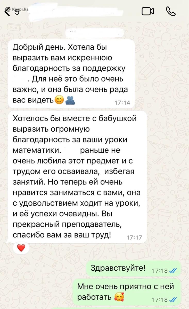 ❗ РЕБЁНОК НЕ ПОНИМАЕТ МАТЕМАТИКУ? — оценки падают — не понимает темы в школе — боится контрольных и экзаменов — подготовка к НИШ вызывает стресс Это можно исправить — с системой и правильным подходом. Я помогаю ученикам понять математику и начать уверенно решать задачи уже в первый месяц. 📌 Онлайн-занятия (Google Meet) 📌 Работаю по школьной программе с 1 по 11 класс 📌 Объясняю просто и понятно 📌 Закрываем пробелы + идём на опережение 📌 Подготовка к НИШ и олимпиадам 🔥 Результаты учеников: — 24 из 27 учеников поступили в спецшколы (НИШ, БИЛ, РФМШ) — ученица в 8 классе без знания дробей → ГОС экзамен на 83% — ученик 6 класса без базы 5 класса → вышел на 4–5 за четверти Обо мне: — окончила НИШ ФМН (математика/физика) на «красный» — студентка Nazarbayev University (Math Major) — готовлю к олимпиадам (Алтын Сака, Зердели и др.) — 5 лет опыта преподавания (онлайн и офлайн) Форматы: — группа (3 человека) — 40 000 ₸ — пара — 55 000 ₸ — индивидуально — 90 000 ₸ (3 раза в неделю по 50 минут) Я требовательная, пунктуальная и довожу учеников до результата. 📩 Напишите, чтобы записаться и определить уровень