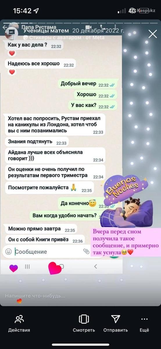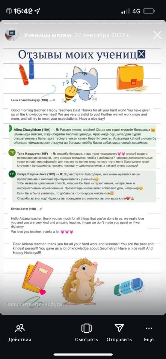 Здравствуйте, я Касанова Айдана Нурлановна — преподаватель математики с 9-летним опытом работы. Свою преподавательскую деятельность я начала еще в студенческие годы, и с тех пор работала со школьниками всех классов — от 2 до 11. 📍 Окончила Евразийский Национальный университет по специальности математика (бокалавриат и магистратура по направлению статистика). 📌 Среди моих профессиональных достижений — работа в престижном Білім-инновация лицее (БИЛ) для одаренных девочек в г. Астана. Сегодня я преподаю в частной школе, помогая ученикам с 5 класса и старше понять и полюбить математику.