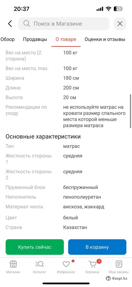 Продается матрас (матрас) Размер 180200 Б/у Мягкий, покупали через каспи в октябре 2025 года, состояние хорошее. Самовывоз из Аксай 4, жк опера