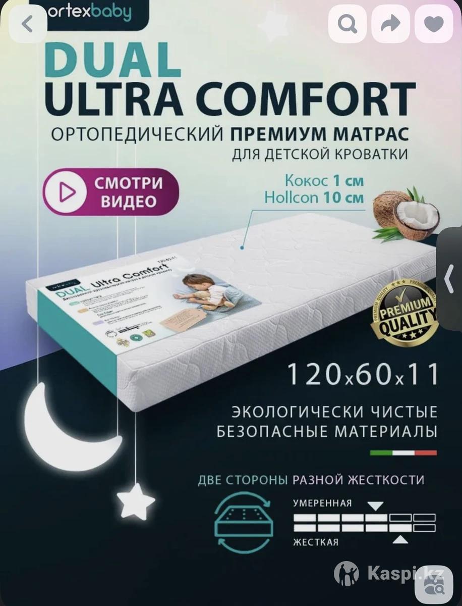ORTEX BABY Dual Ultra Comfort 120 х 60 см. Высота: 11 см. Двухсторонний ортопедический матрац премиум класса в детскую кроватку для новорожденных 120x60. Здоровый сон и гармоничное развитие опорно-двигательного аппарата, от рождения до 3-4 лет. Матрасик имеет две стороны разной жесткости: 1 сторона (высокая жесткость) Натуральная кокосовая койра 1 см. Кокос - упругий и натуральный наполнитель высокой жесткости. Длинные волокна кокосовой койры скреплены натуральным латексом. Натуральный кокос, в отличии от дешевого би-кокоса: не крошится и не рассыпается, не впитывает влагу и запахи, препятствует размножению бактерий. Данный наполнитель обеспечивает надежную поддержку позвоночника малыша, что важно на начальном этапе его формирования от 0 до 12 месяцев. Чтобы волокна не кололись через чехол матраса - кокос оборачивается в защитный слой Eco Fiber. 2 сторона (умеренная жесткость) Hollcon Hard 10 см - самой высокой плотности 2000 г/м2. Экологически чистый материал нового поколения, обладающий анатомическими свойствами. Благодаря вертикальной укладке полиэфирных волокон, материал лучше восстанавливает форму и обладает умеренной жесткостью. Адаптируется под контуры тела, прекрасно вентилируется. Высокая плотность волокон обеспечит низкую деформацию при использовании и более долгий срок службы изделия. Чехол на молнии Air Sleep, из высококачественного стеганного трикотажа, на молнии по периметру. Невероятно мягкий и приятный на ощупь. Уход за чехлом: деликатная стирка при 30 градусах, на слабом отжиме. Максимальная нагрузка на матрасик 20 кг.